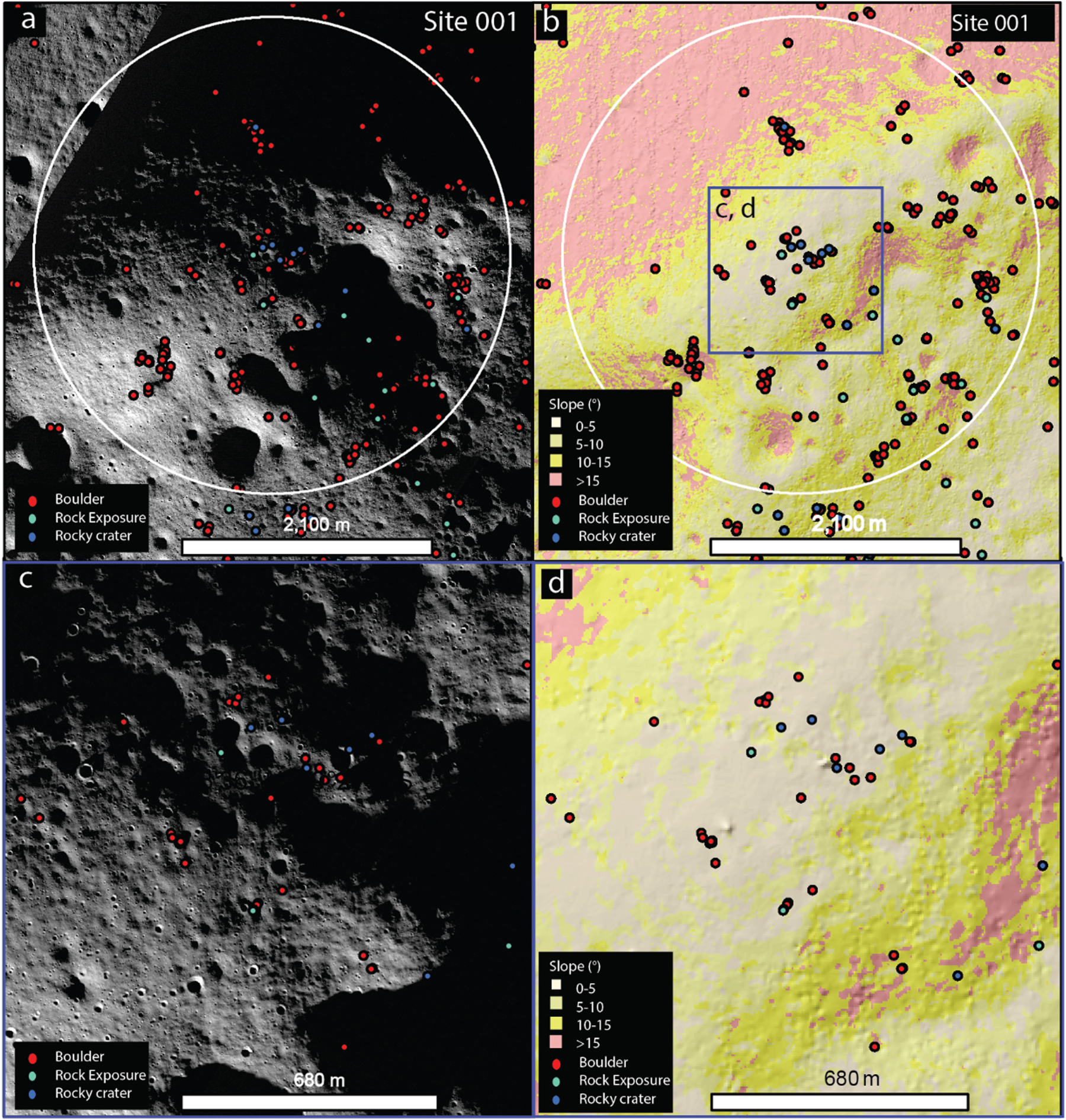 (a) 2 km exploration zone around site 001 shown on NAC mosaic (1 m pixel−1), all features shown. (b) 2 km exploration zone on LOLA (5 m pixel−1) derived slope map, blue box shows the extent of (c) and (d) which is a more accessible region with slopes of less than 10°. Scale bars in (a) and (b) are 2400 m and scale bars in (c) and (d) are 680 m. (c) NAC mosaic at more accessible area within the site 001 exploration zone. (d) Detail of the LOLA derived slope map.