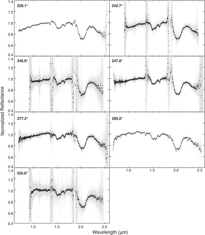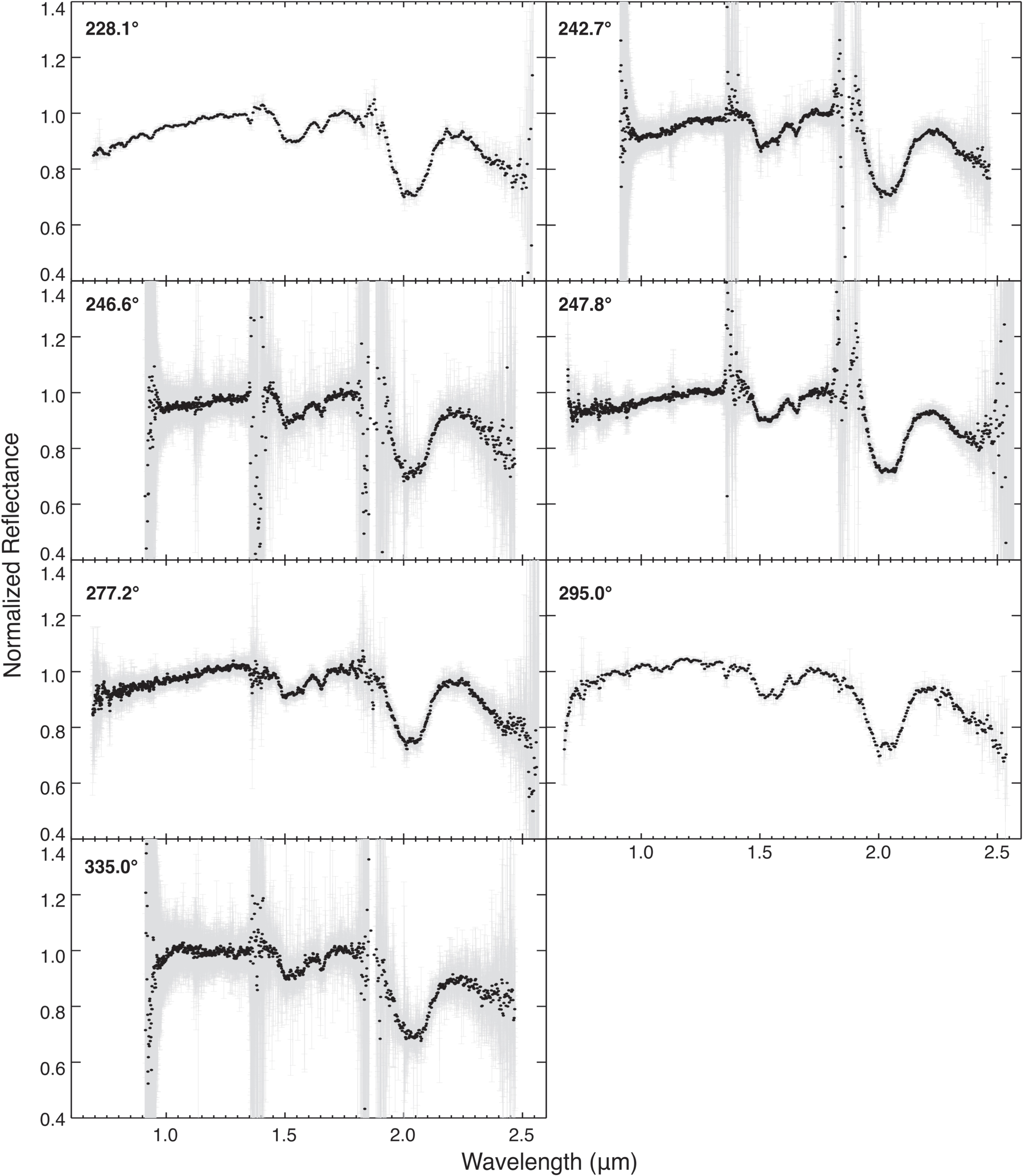 Seven reflectance spectra of Umbriel. All 15 spectra (A2, A3) were normalized to unity between 1.74 and 1.77 μm. These spectra were smoothed using the boxcar function described in the caption of Figure 1 (black), along with the 1σ uncertainties shown at their native resolutions (gray). The mid-observation subobserver longitude is listed in the top left corner of each plot. Relevant observing information for each spectrum is summarized in Table 1, organized by subobserver longitude. The greater point-to-point variation and lower S/N between 1.08 and 1.14 μm, 1.31 and 1.46 μm, 1.78 and 1.96 μm, and ≳2.35 μm results from increased telluric absorption in these wavelength regions. The sensitivities of SpeX (SXD mode) and TripleSpec are lower at wavelengths <1.4 μm and >2.3 μm, further reducing the S/N beyond these wavelengths. Additional structure at wavelengths <1.3 μm in some of the spectra results from scattered-light contributions from Uranus.