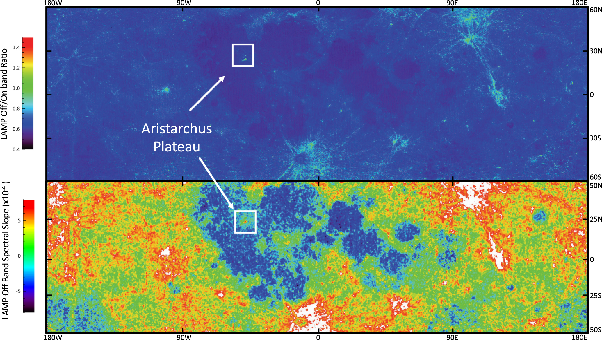 Top: LAMP global Off/On-band albedo ratio map with ∼32 pixel deg−1 resolution, covering −180 to 180 longitude and −60 to 60 latitude. Bottom: Off-band (155.57–189.57 nm) spectral slope map with ∼32 pixel deg−1 resolution, covering −180 to 180 longitude and −50 to 50 latitude (Byron et al. 2021). Aristarchus crater and the surrounding plateau stand out from the maria with elevated values in both the Off/On-band ratio map and Off-band spectral slope map.