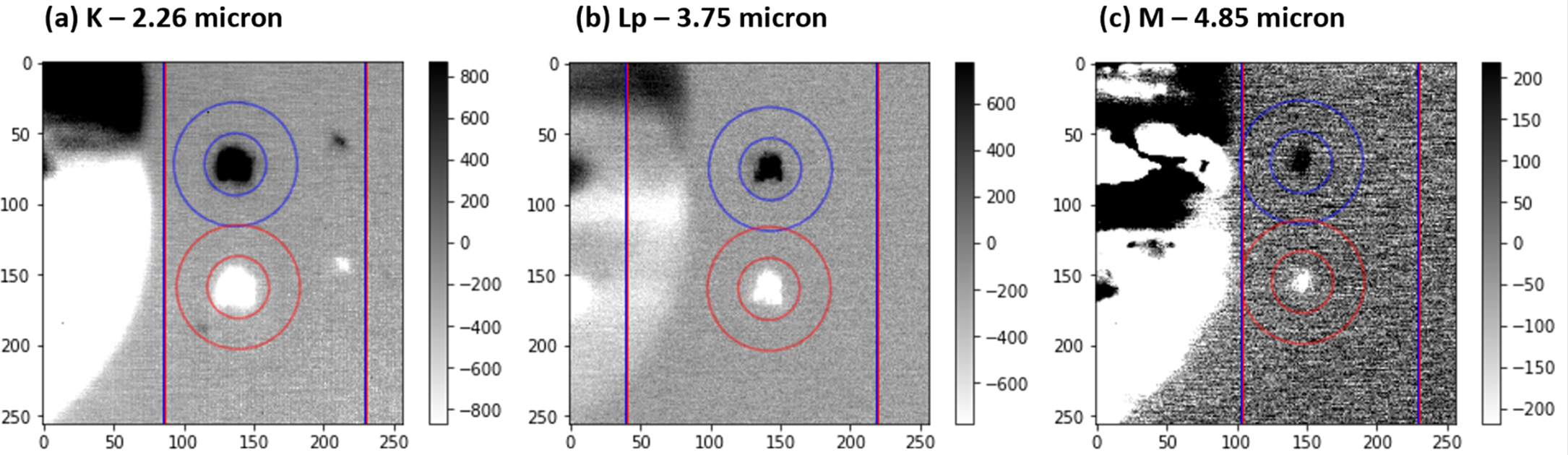 Images of Io and Jupiter from the IRTF SpeX camera during the outburst event of 2019 May 8. Io is in eclipse. The images are the infrared photometric filters (a) narrowband Kcont 2.3 μm, (b) broadband Lprime 3.8 μm, and (c) broadband 4.5–5.1 μm M band (see Table 2). The double effect in the images is due to the subtraction of A and B frames when the telescope nods by 5″ in the north–south direction to remove the telescope's and atmosphere's first-order thermal effects. The frames are 30″ across. Notice the other Jovian moons visible in the contK-band image that disappear in the longer-wavelength images. The Lprime is used for the occultations both because of its sensitivity to thermal anomalies on Io and because Jupiter itself is less bright due to its methane absorption. The signal-to-noise ratio is noticeably lower for the M-band images.