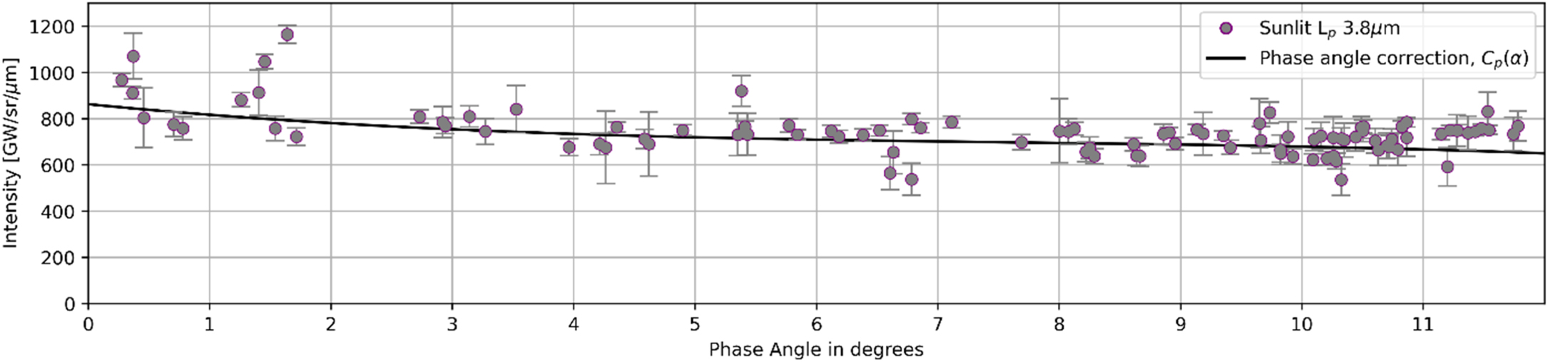 Phase angles of Io's total brightness values for the sunlit observations. Of the full range from 0° to 12°, there are 12 sunlit observations with phase angles below 2°. These low phase angle observations in reflected sunlight may have a significant brightness contribution from the opposition surge effect.