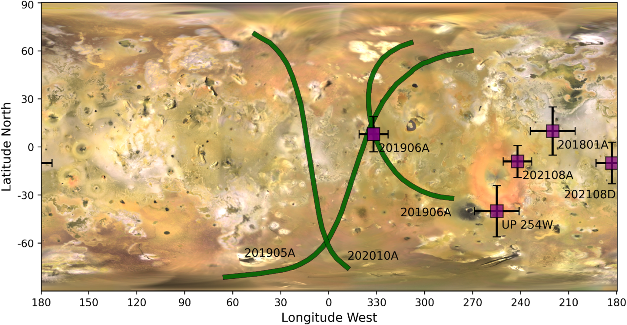 Map showing the constrained locations of the outbursts characterized in this paper. The green lines are the occultation detections, and the outburst can be anywhere along the line. The purple squares show the outbursts discovered in sunlight; the black lines are their localization uncertainties.