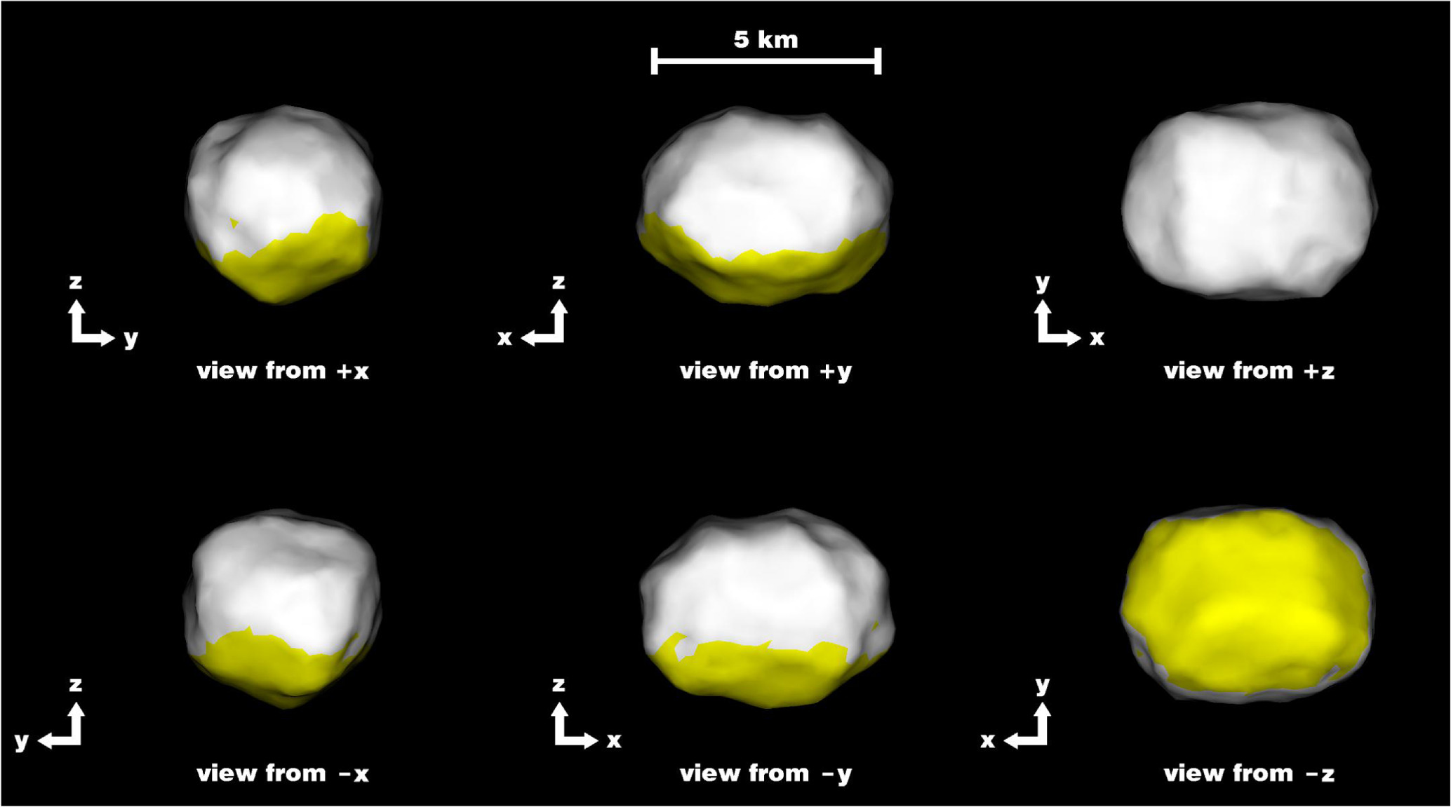 Final shape model for Atira with a volume-equivalent diameter of 4.92 ± 0.95 km viewed along the principal axes. Yellow regions indicate facets that were seen at incidence angles greater than 60° (or not seen at all) in all delay-Doppler images and therefore have shape details that are not well constrained. The model shows the asteroid to be relatively round and shows concavities, seen in the +Y and −Y directions viewing from +Z, that most likely produce the characteristic “flat” edge in delay-Doppler images such as the bottom row of panels of Figure 2.