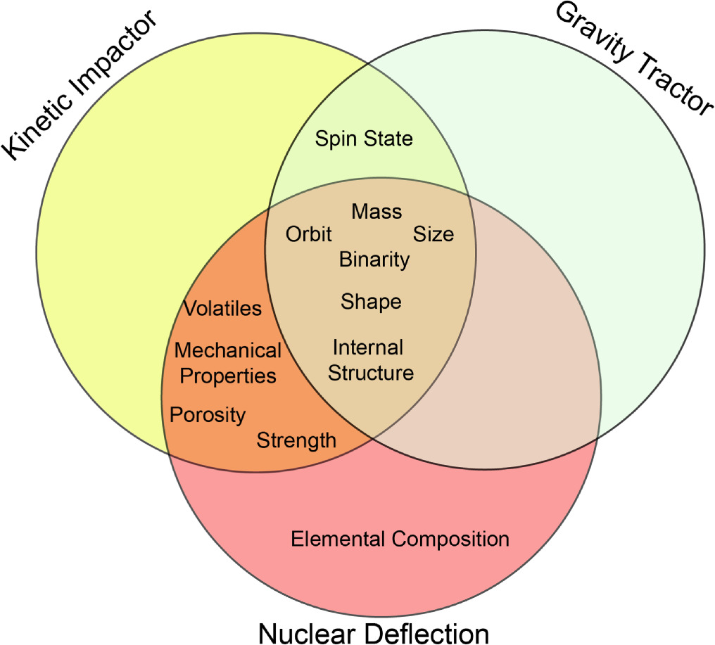 Important measurements and properties of interest for three main planetary defense mitigation techniques. The PD tour mission measurements would be relevant for all three potential deflection missions.