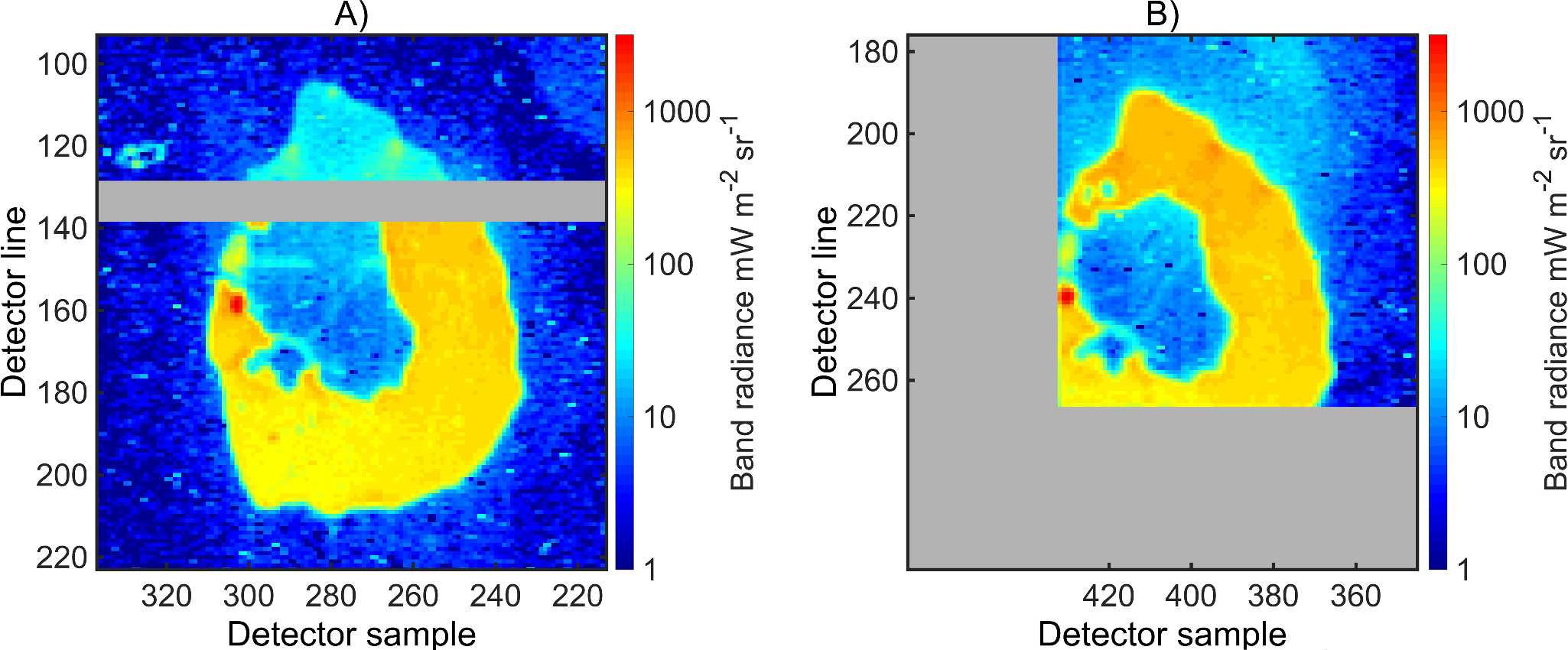 Two unprocessed and unprojected images of Loki P. taken during orbit 58 (2024 February 3; panel (A) at 17:54:10 and panel (B) at 17:54:40). Only a square 2 × 1 pixel filter has been applied to remove the odd–even effect. In panel (A), the gray band is a 10 pixel wide inactive region of the detector, which separates the part of the detector that is placed beyond the L-band filter (lines from 1 to 128) and that beyond the M-band filter (lines from 139 to 266). In panel (B), the gray area is outside the detector. A faint, diagonal line of brighter radiance, going from the southwest part of the central island to the northeast one, is visible in both images. The horizontal region in the central island, at line ∼150, is probably an artifact of the detector since it is visible only in panel (A). A second, fainter diagonal line, going from west-southwest to northeast, is barely visible in panel (B).