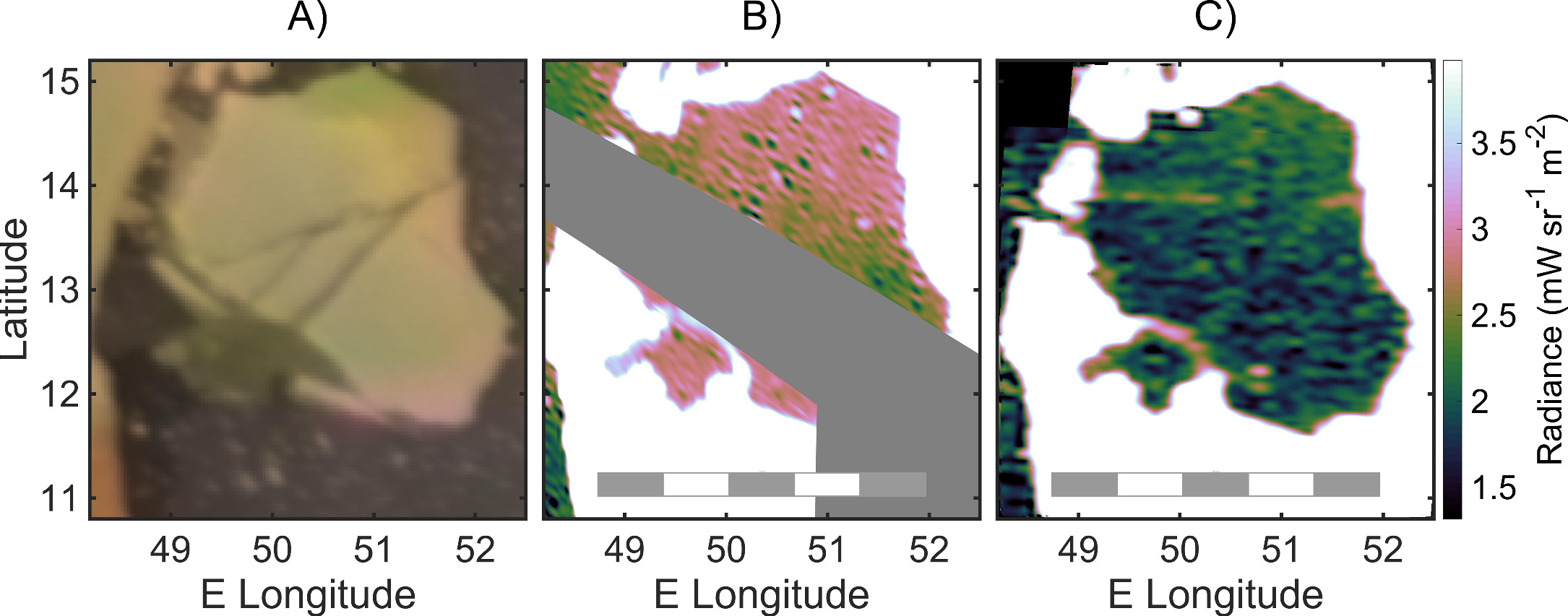Visible image of Loki Patera (panel (A)), and M-band radiance maps of the central island (integrated from 4.5 to 5 μm) taken during Juno’s orbits 57 and 58 (panels (B) and (C)).