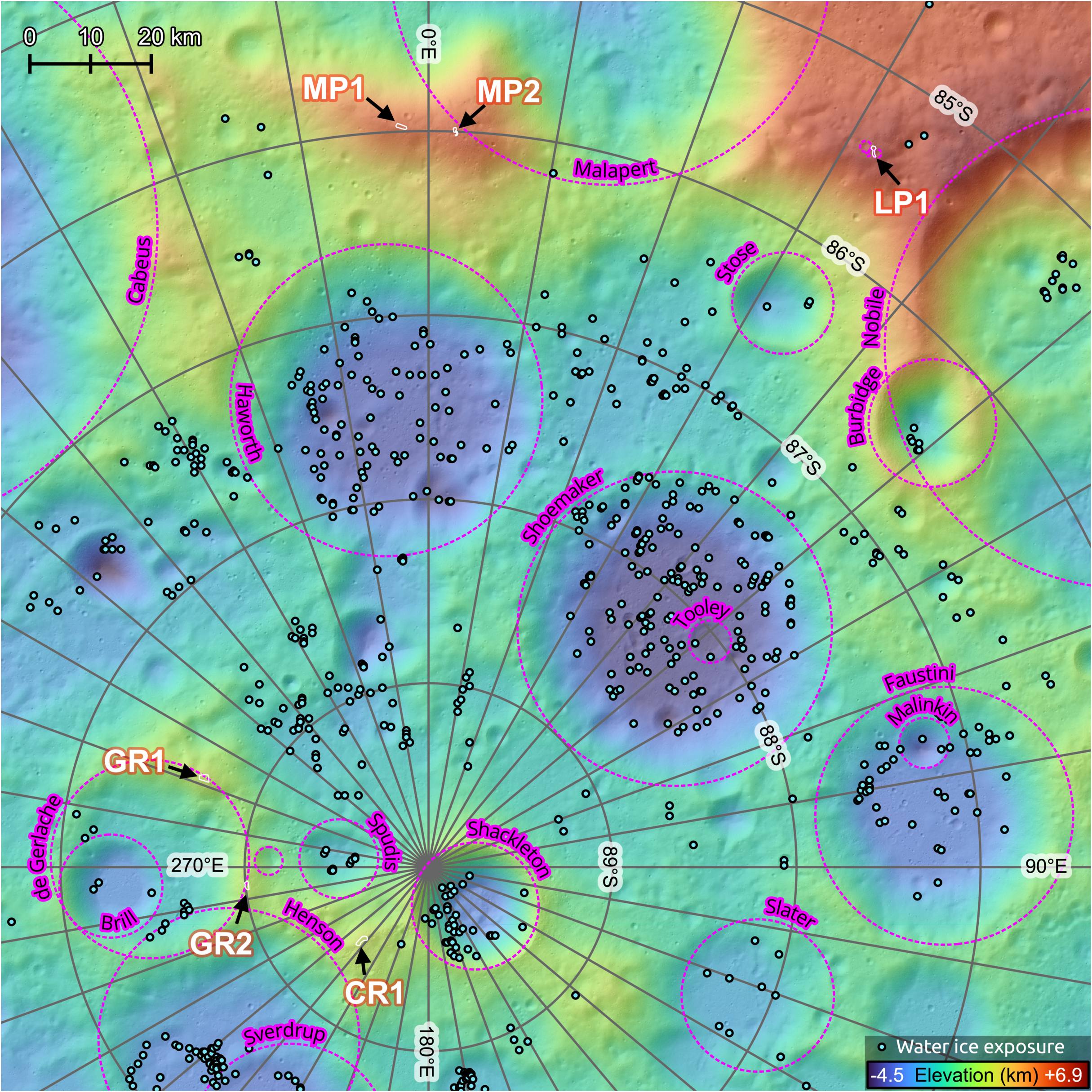 Target ROIs (white polygons) pointed to by arrows with the site names of D. De Rosa et al. (2012). Pink dotted circles with labels represent named craters listed in the IAU nomenclature. Light blue dots show the distribution of the purported exposed water ice (S. Li et al. 2018b). The colorized shaded map is based on the LOLA DTM, gridded at 40 m resolution in south polar stereographic projection.