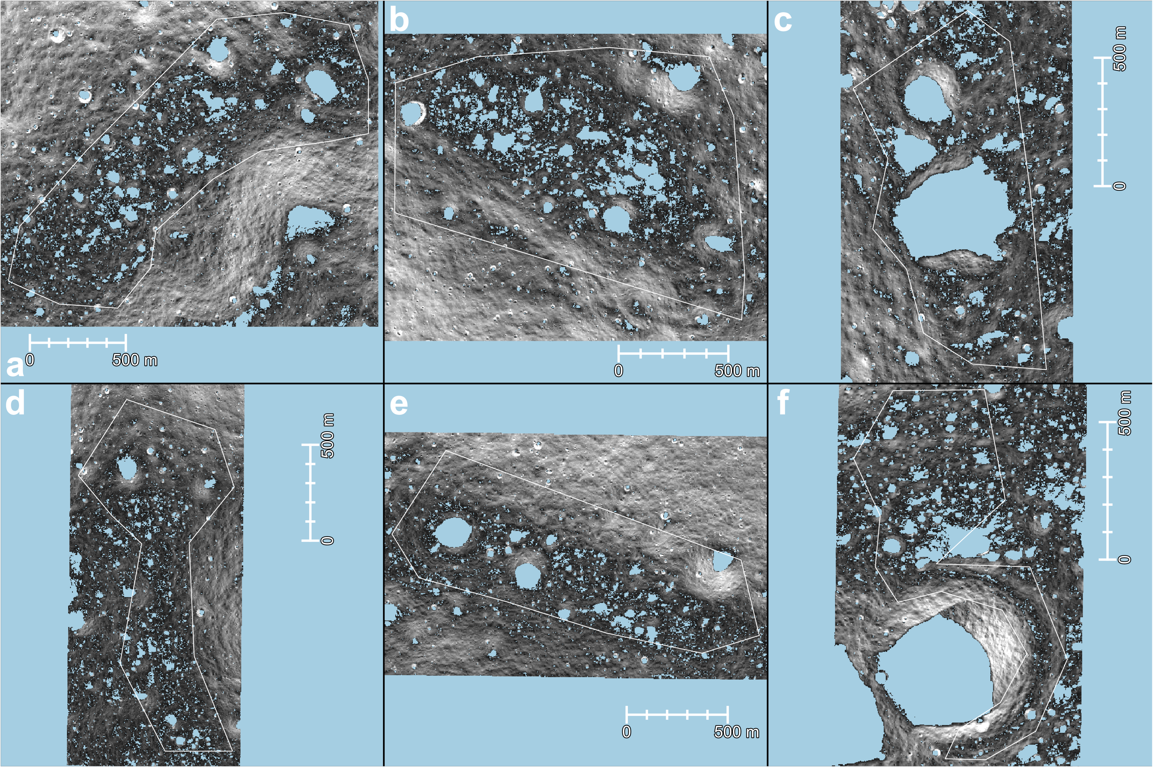 The orthomosaics of our SfS DTMs. Image resolution is ~1 m pixel−1. (a) CR1, (b) GR1, (c) GR2, (d) LP1, (e) MP1, (f) MP2. NoData pixels are not rendered, allowing the light blue backgrounds to remain visible. Each orthomosaic is contrast-enhanced. The spatial extents and white polygons are the same as those in Figure 9.