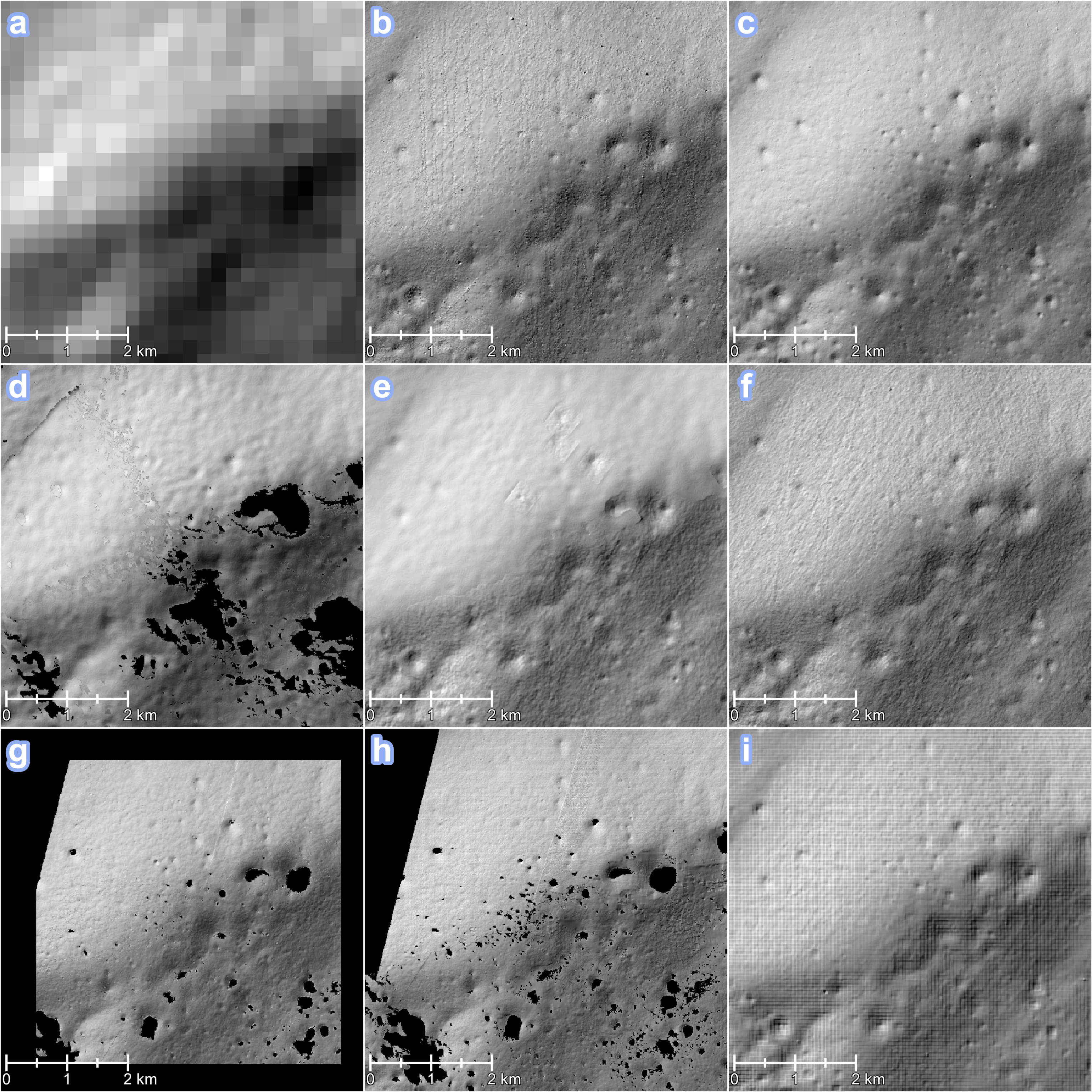 Comparison of SP DTMs in the vicinity of CR1. Each dataset is presented as a shaded-relief image in a south polar stereographic projection with an illumination altitude of 30° and an azimuth of 315° clockwise from north. The DTMs shown are as follows. (a) LALT DTM (ID: LALT_GT_SP_NUM; regridded at ~236.90 × 236.90 m). (b) LDEM (ID: LDEM_875S_5M_FLOAT; we used this product as a vertical source of controlled DTMs as described later). (c) One of SPLDEM2021 (ID: Site01_final_adj_5mpp_surf). (d) DTM TC ORTHO (each product shows NoData holes from per-scene coverage and shadow masking), four overlapping DTMs without manual georeferencing (see Table 2 for IDs of CR1; we used this product as a vertical source of controlled DTMs as described later). (e) DEM TC ORTHO (each of them is a composite product that gap-fills across scenes but can introduce horizontal/vertical offsets at joins), ID: DTMTCOw01_00570S897E1937PS. (f) SLDEM2013, 41 DTMs (products with IDs between DTM_MAP_01_S89E200S90E201SC and DTM_MAP_01_S89E240S90E241SC in sequential order). (g) LROC DTM produced by the ESA lander mission (ID: NAC_DTM_ESALL_CR1). (h) LROC DTM produced by the USGS (ID: MOON_LRO_NAC_DEM_89S210E_4mp). (i) CE2 CCD stereo global DEM (ID: CE2_GRAS_DEM_20m_N001_87S000W_A). DTMs around the CR1 region that contain many NoData pixels, have insufficient spatial resolutions, or are publicly inaccessible are not included.