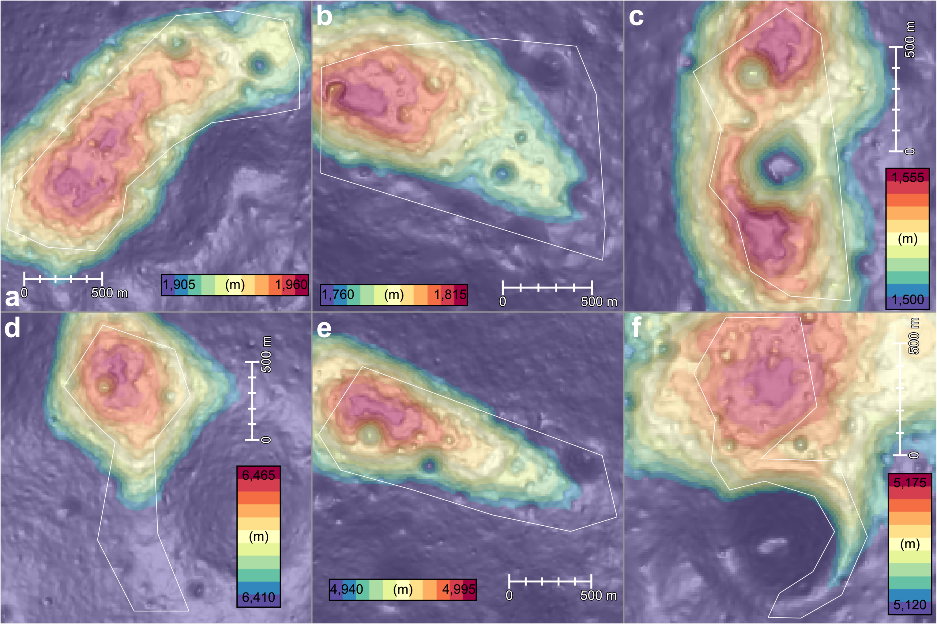 Close-up views of the six target sites, represented by color-coded elevation of the 10 m pixel−1 SPLDEM2021 mosaic (M. K. Barker et al. 2023) combined with shaded relief. (a) CR1, (b) GR1, (c) GR2, (d) LP1, (e) MP1, (f) MP2. The relative height range of 55 m is divided into 11 5 m intervals. White polygons indicate areas we identify as suitable for future landing/roving. The shaded relief is visually enhanced with 10× vertical exaggeration and overhead illumination.