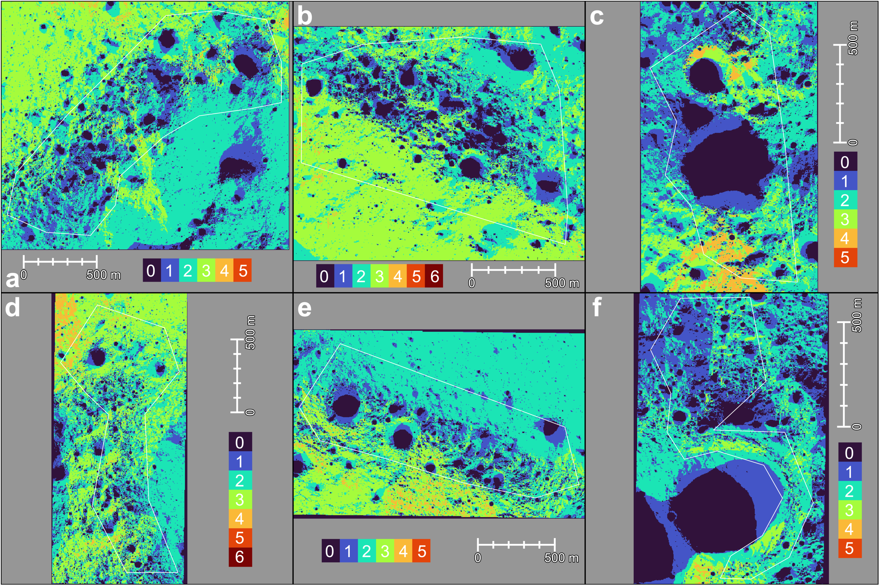 The total population of valid overlapping pixels among individual orthoimages. (a) CR1, (b) GR1, (c) GR2, (d) LP1, (e) MP1, (f) MP2. Each of the orthomosaics in Figure 10 was produced from these orthoimage pixels. The spatial extents and white polygons are the same as those in Figure 9. NoData pixels of DTMs in Figure 9 (orthoimage pixel values ≤0.004) are counted as zero.