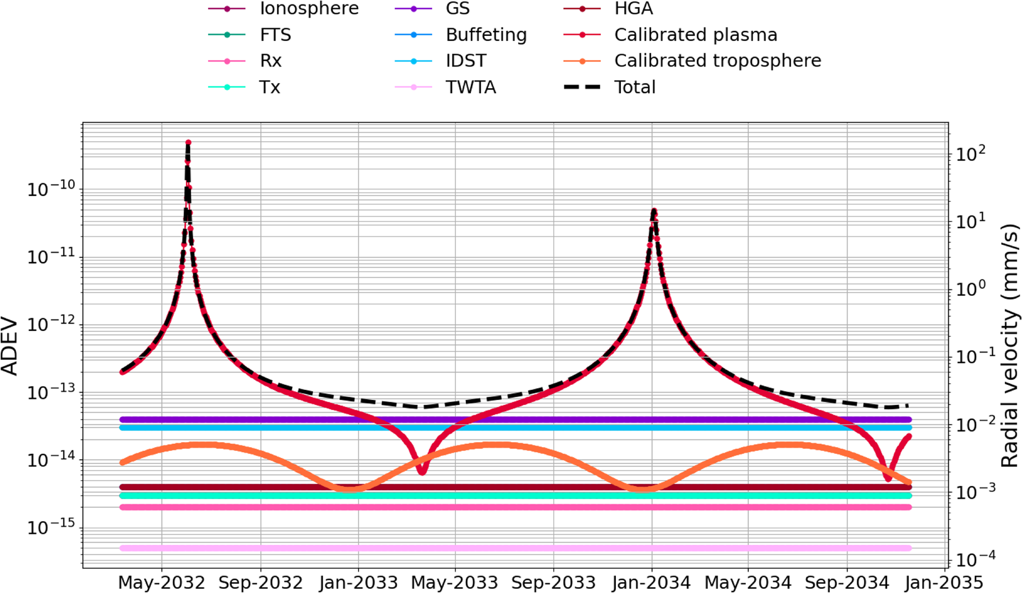 VERITAS Doppler error budget at τ = 10 s integration time assuming only X-band tracking for plasma (i.e.,﹩{P}_{\mathrm{calib}}=0,\,{\nu }_{0}=7.8﹩ GHz in Equation (15)).