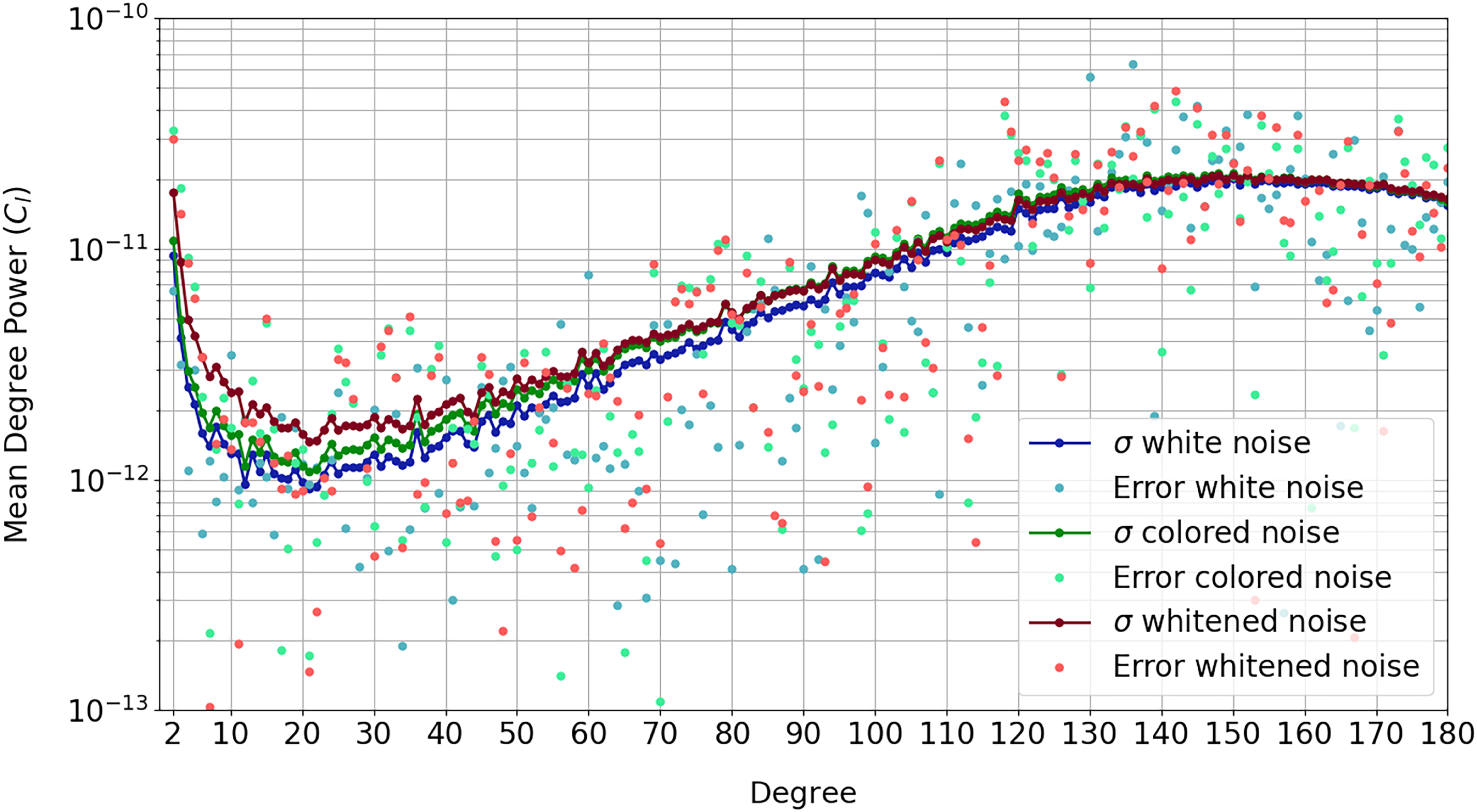 Gravity field amplitude spectrum assuming only X-band tracking for the plasma noise (i.e., ﹩{P}_{\mathrm{calib}}=0,\,{\nu }_{0}=7.8﹩ GHz in Equation (15)).