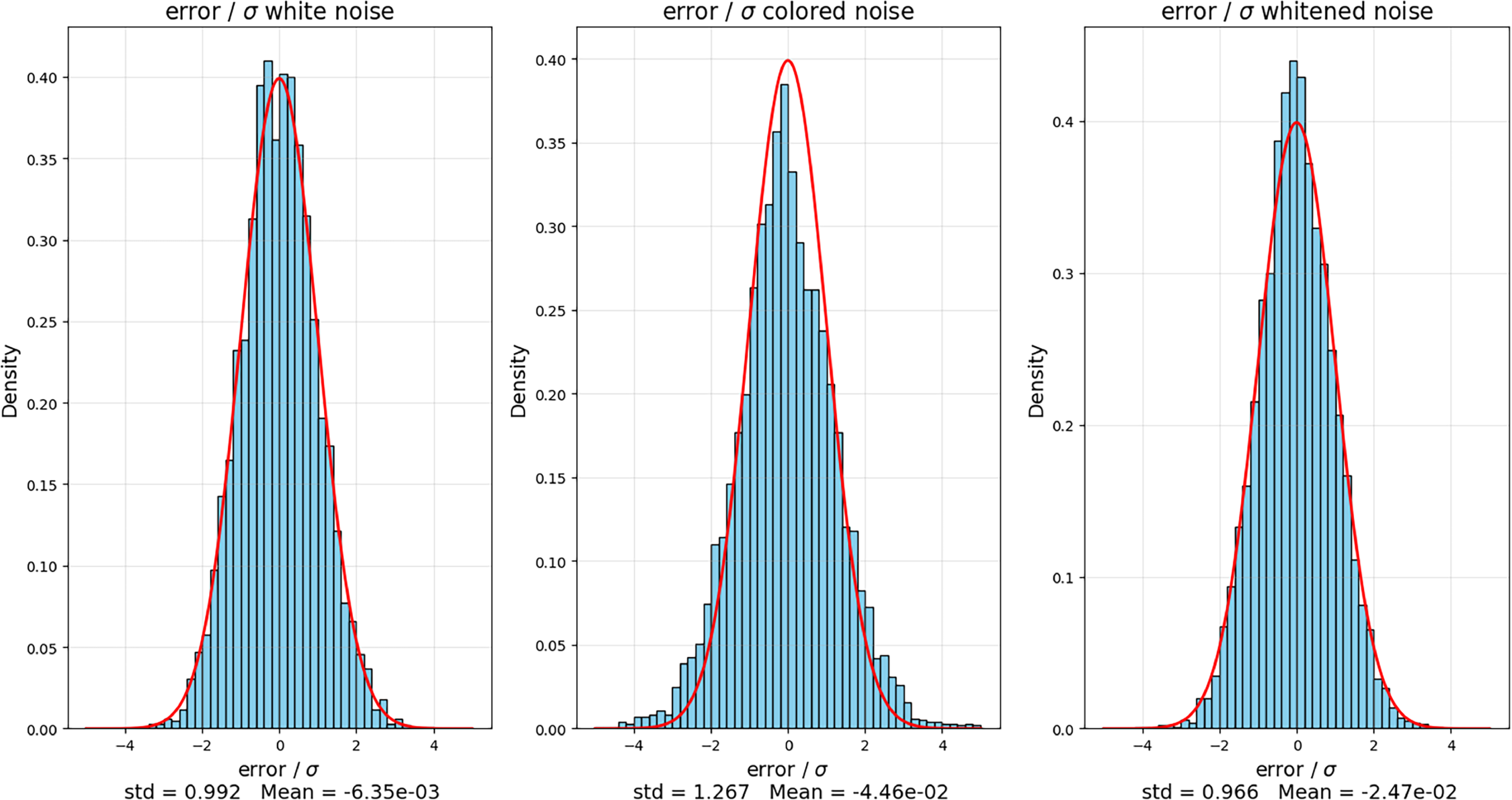 Histogram of the ratio between estimated errors and formal uncertainties for the white noise, colored noise, and whitened noise cases, assuming only X-band tracking for the plasma noise. For reference, a red curve shows the standard Gaussian distribution. The mean and standard deviation of each case are also reported. Only coefficients up to degree 70 are included, since the lower degrees are the most affected by noise, while at higher degrees the solution is dominated by the Kaula constraint.