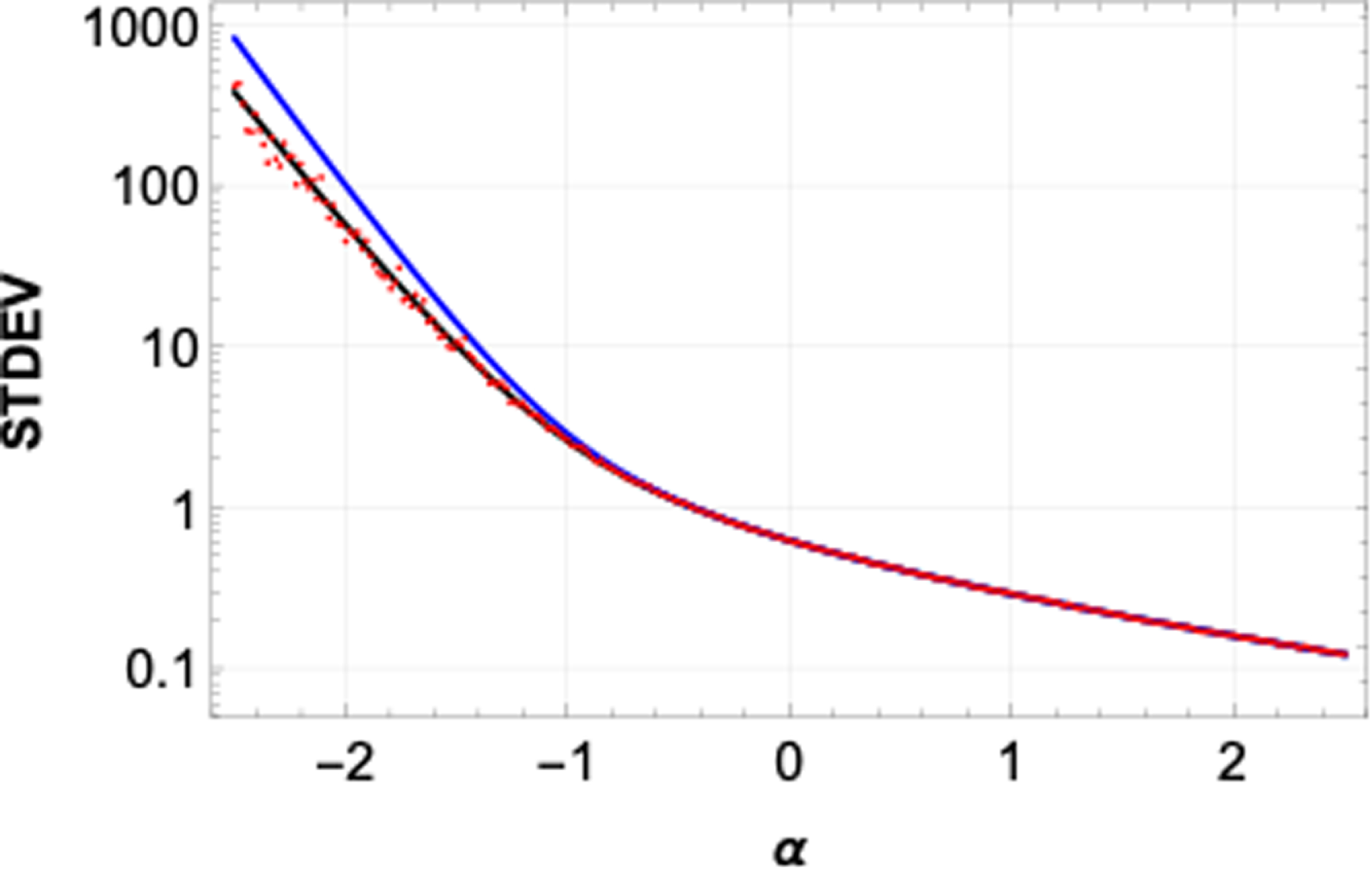 Expected STDEV of simulated ﹩{y}_{1}﹩ data calculated by using the discrete formula (Equation (A.26); black line) and the continuous formula (Equation (A.8); blue line, with cutoffs) as functions of ﹩\alpha ﹩. We assumed ﹩{h}_{y}=1﹩, ﹩N={10}^{5}﹩, ﹩{\rm{\Delta }}t=1﹩ s, and ﹩\tau ={\rm{\Delta }}t﹩. Red points represent the STDEVs of the simulated Doppler data ﹩{y}_{1}﹩ for several values of ﹩\alpha ﹩.