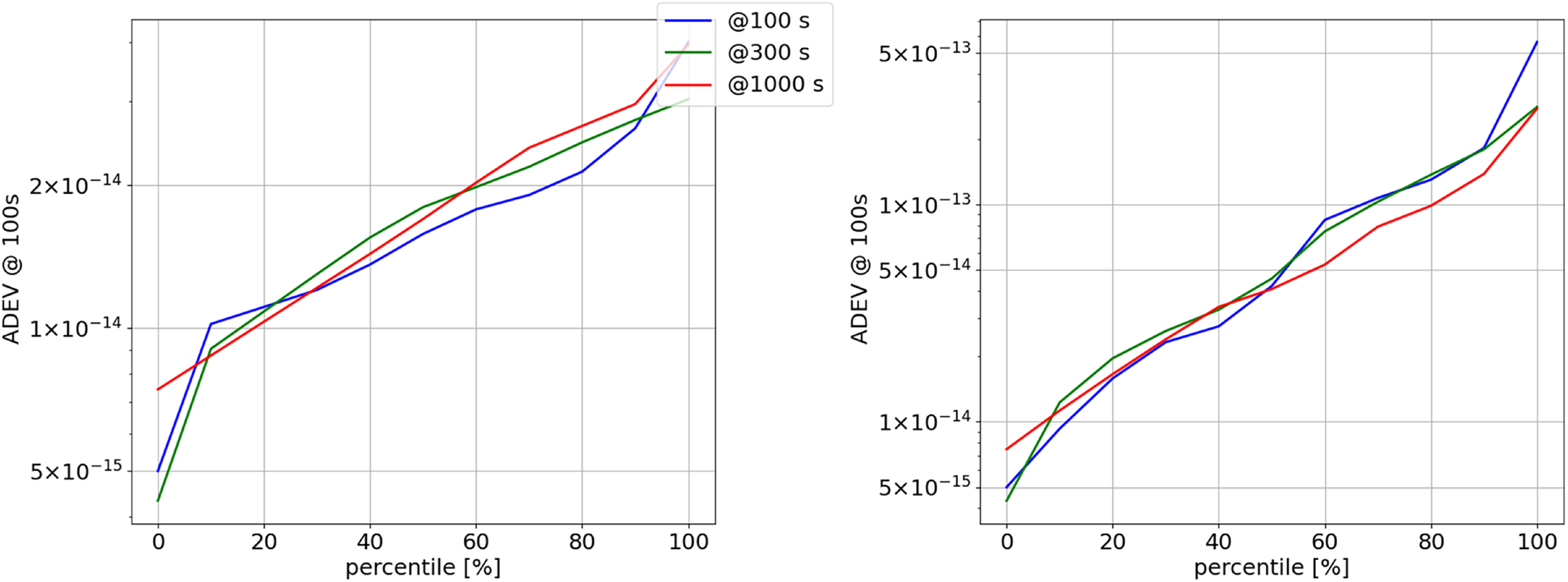 Wet troposphere ADEV (Cassini data). Left: winter. Right: summer. Data correspond to 100 s (blue), 300 s (green), and 1000 s (red) integration time. All data have been rescaled to 100 s by the ﹩{\left(\tau /100\right)}^{-1/2}﹩.