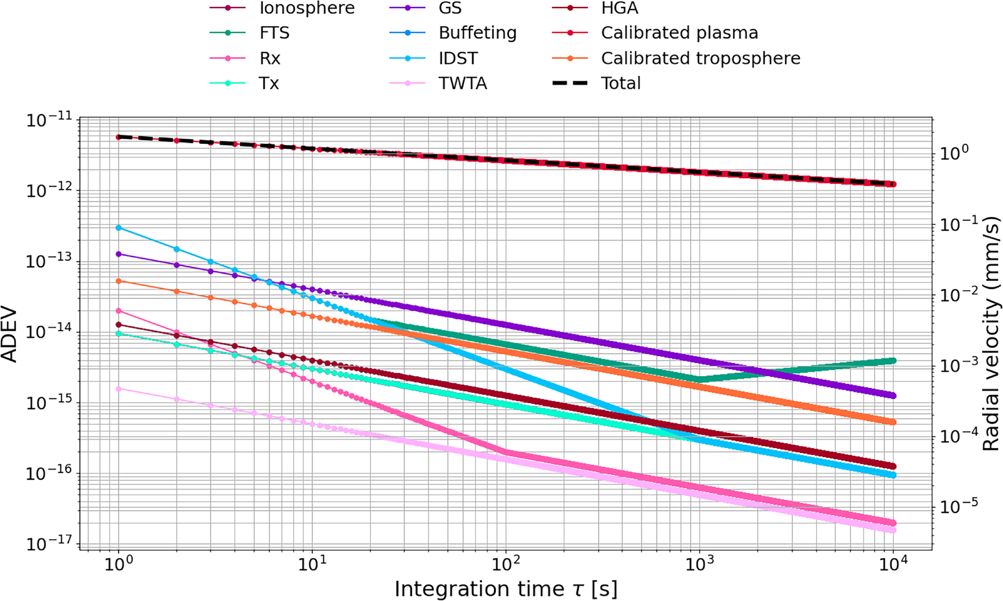 ADEV vs. integration time ﹩\tau ﹩ for an epoch near a superior solar conjunction. The dominant noise is the plasma, and the total Doppler noise is colored.