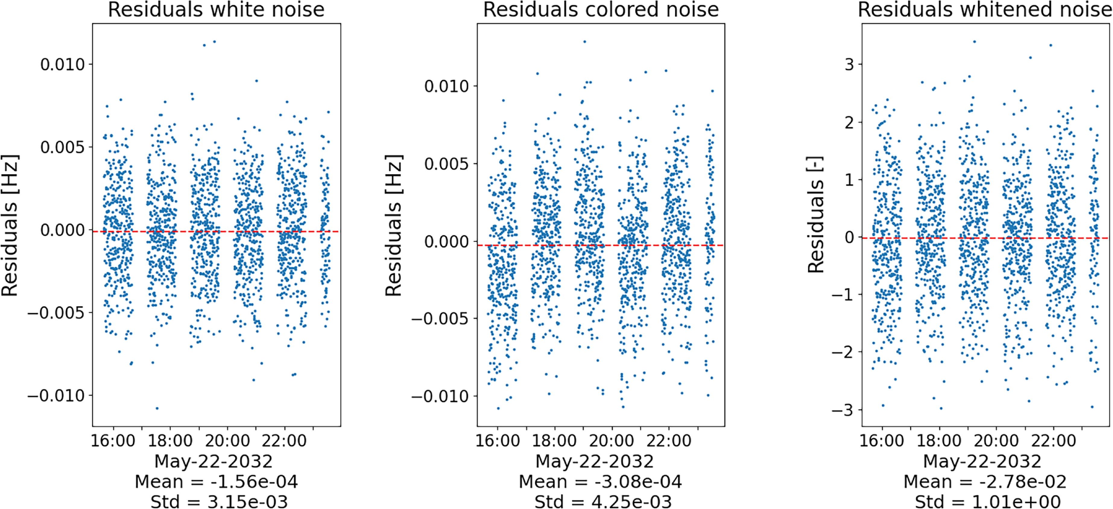 Doppler residuals for the first tracking pass of arc 22 in the three simulated cases: white noise (left), colored noise without whitening (middle), and colored noise with whitening applied (right). The red line indicates the mean value.