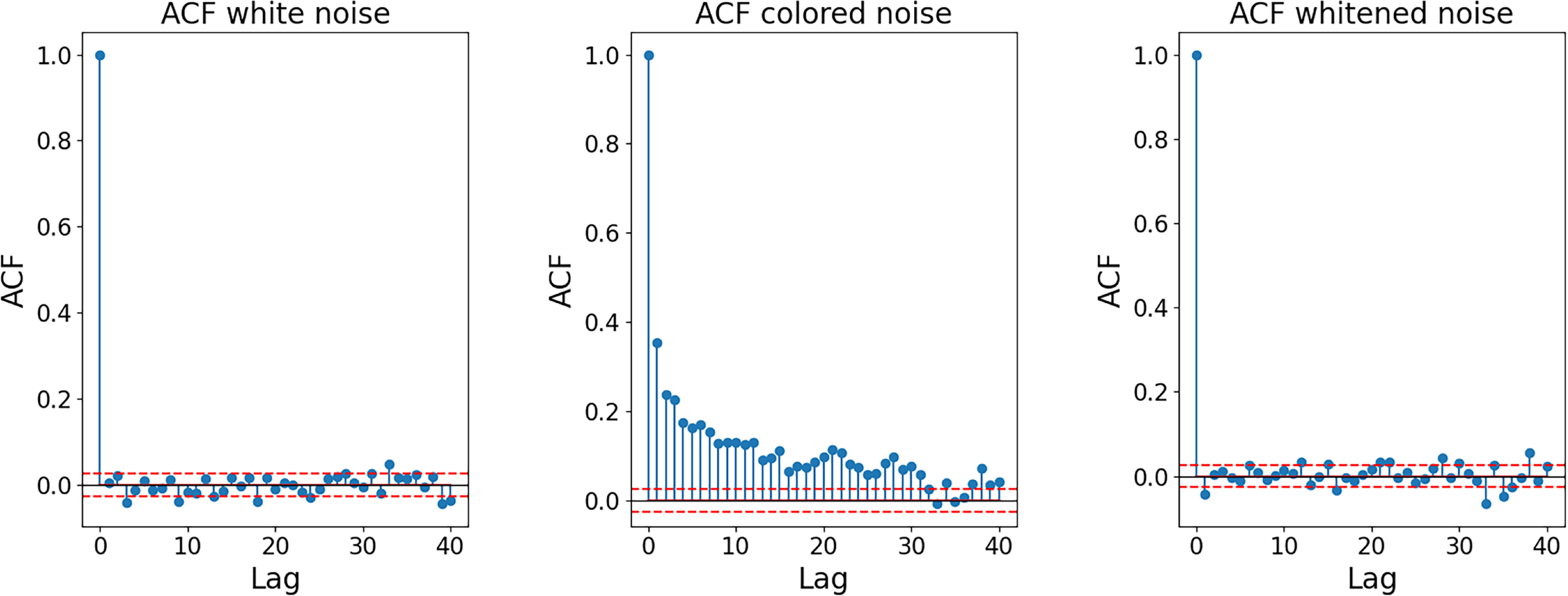 ACFs of the residuals for the first pass of arc 22 for the three simulated cases: white noise (left), colored noise without whitening (middle), and colored noise with whitening applied (right). The lag axis is truncated at 40. Lag is expressed in number of samples.