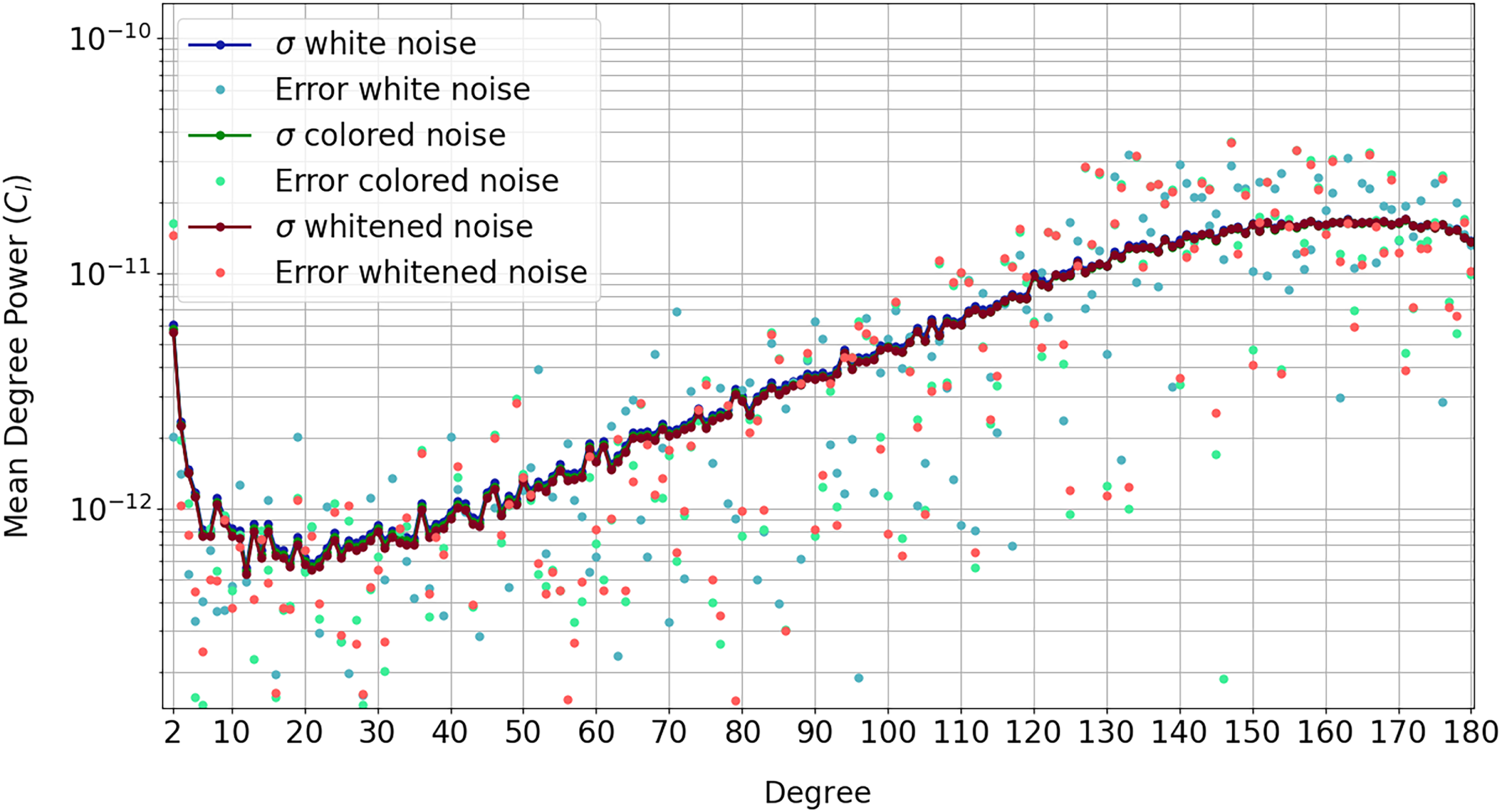 Spectrum of gravity field uncertainty and error for the white noise, colored noise, and prewhitened noise case. Both formal uncertainties and estimated errors are plotted.