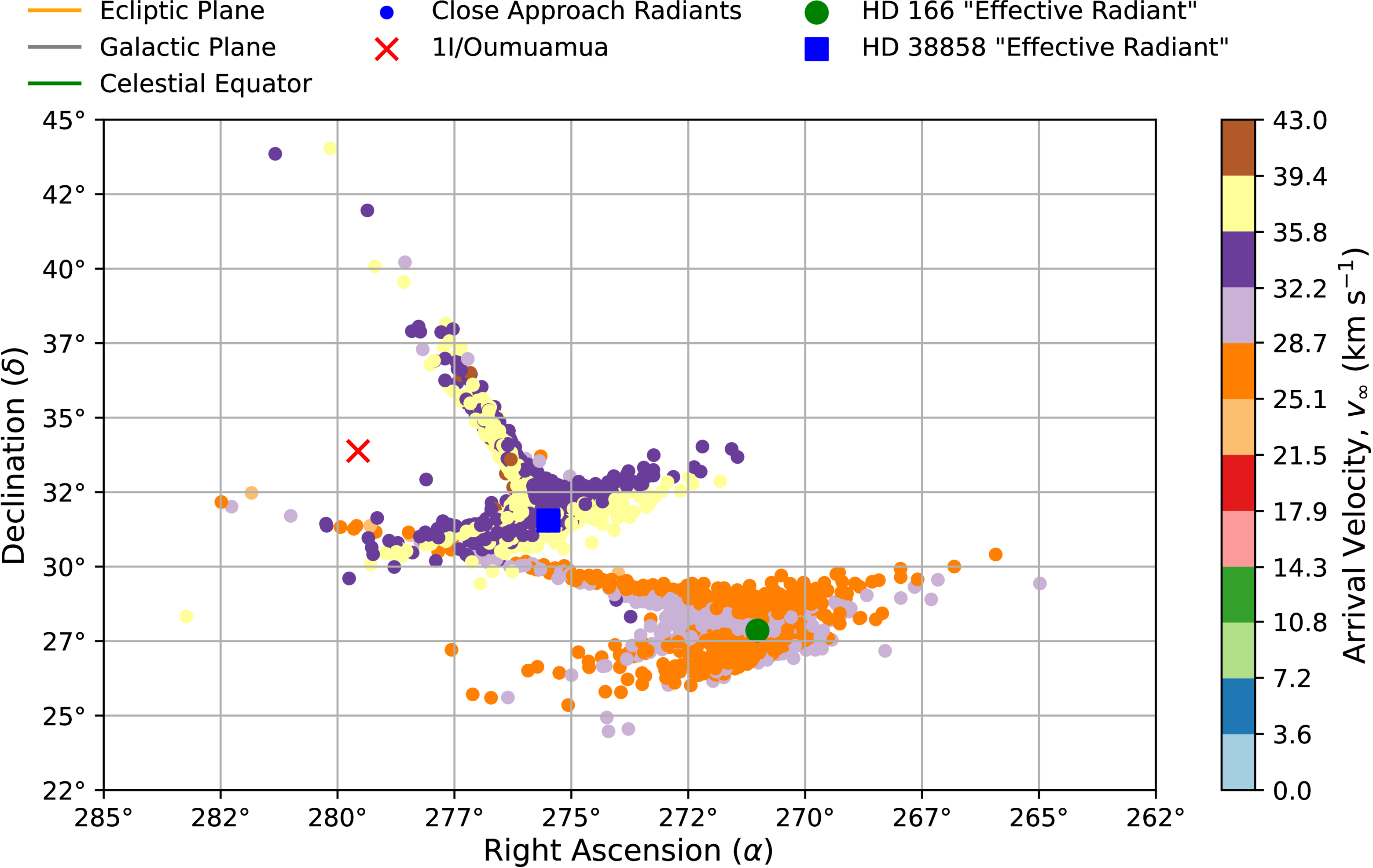 This is a zoomed-in version of the radiant plot in Figure 2, focusing on the direction in which 1I/’Oumuamua arrived. HD 38858 and HD 166 are the only systems plotted, to show the comparison in the radiant of their particles’ arrival directions. These particles are colored by their arrival velocity v∞.