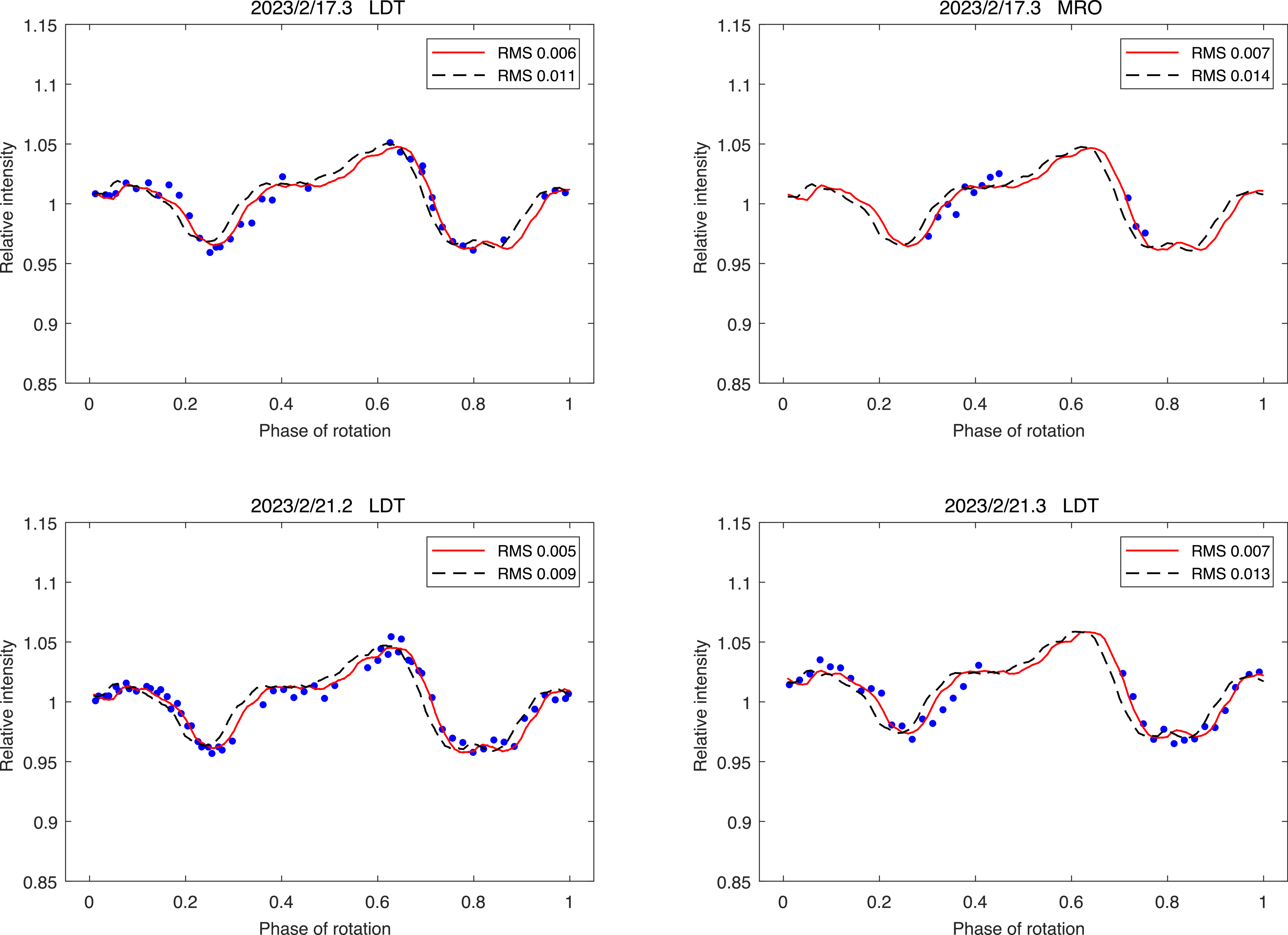 Example light curves at which the difference between the constant-period model (dashed black curve) and the model with the two different periods (solid red curve) is most prominent. The blue points are measured photometric data normalized to the unit mean brightness.