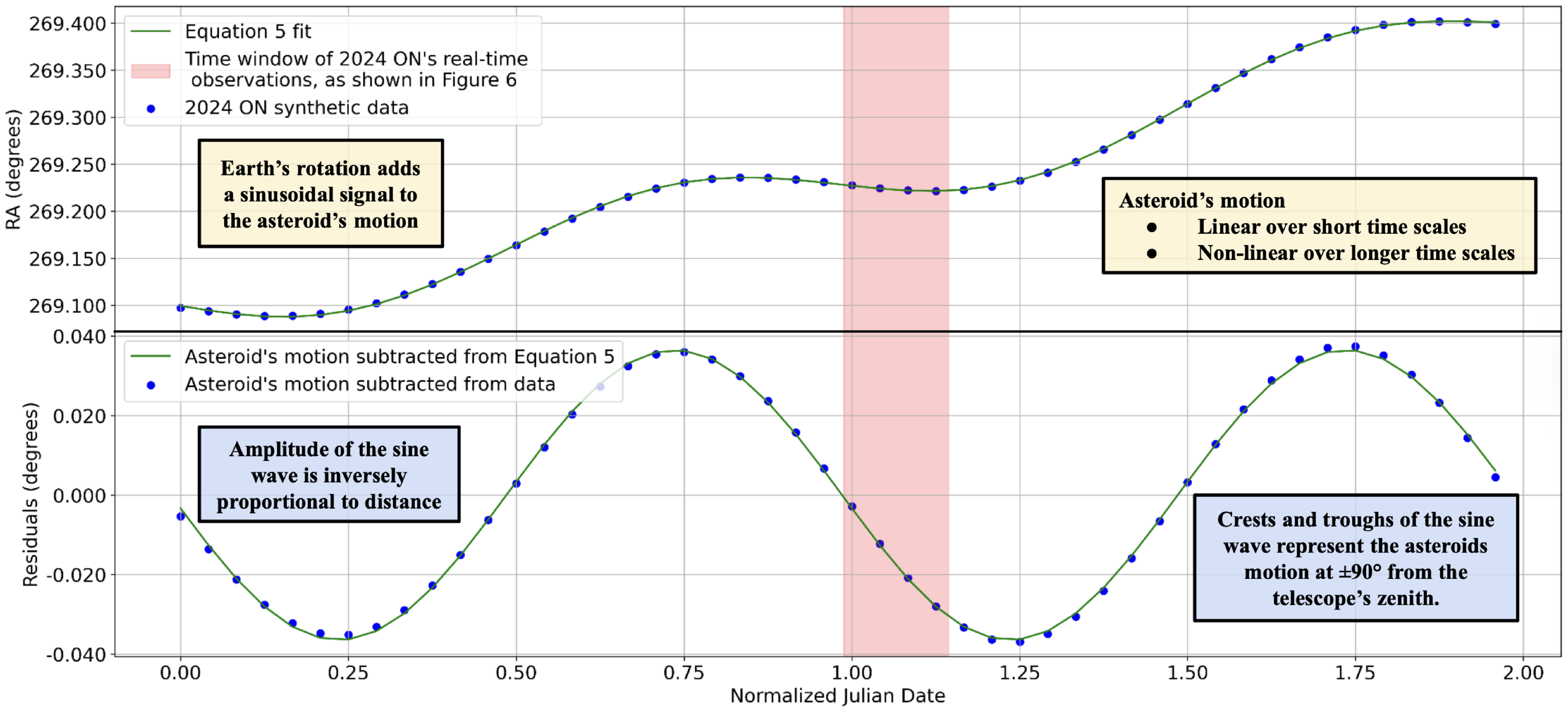 We obtain synthetic data for asteroid 2024 ON from Horizons. The ephemerides are generated by numerically integrating the orbits of celestial objects to their real-time observations (W. M. Folkner et al. 2014). (Top panel) The raw R.A. positions as a function of time, where the dots indicate the 48 observations taken from 2024 September 5–6 at every hour. The first-order behavior is due to the asteroid’s motion. The smaller sinusoidal behavior is due to the rotation of the Earth. (Bottom panel) The remaining sinusoidal behavior after subtracting out a second-order polynomial fit is shown in blue dots. The period of the sine curve due to the rotation of the Earth is 1 day and indicated by the green line. The amplitude of the sine curve is used in Equation (3) to measure the distance to the asteroid as seen in Equation (4). The amplitude changes with time as the distance to the asteroid changes with time. The highlighted red region in both rows represents the real-time observations of 2024 ON, as discussed in Section 3 and seen in Figure 6.