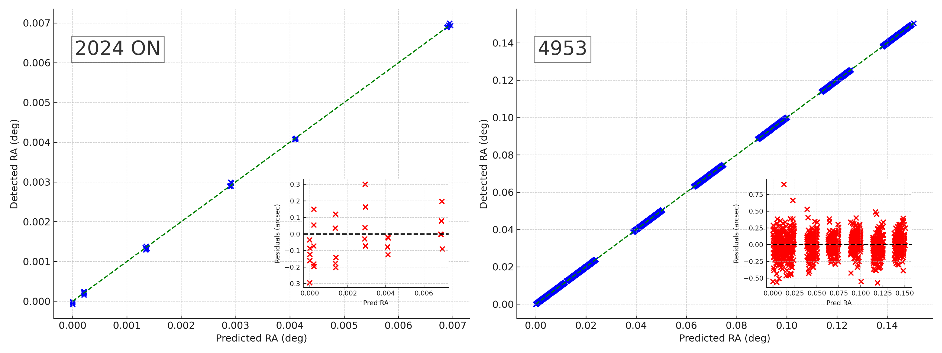 (Main) Measurement of detected R.A. positions from real-time observations versus predicted R.A. from Horizons for asteroids 2024 ON (left) and 4953 (right). We set the initial R.A. position of the first asteroid detection at 0.0. A line of y = x is overplotted. (Insets) The residuals of the detected R.A. to the predicted R.A. For 2024 ON, seven observations were done in groups of five exposures every ∼45 minutes. For 4953, 1049 observations were collected at six different times in groups of ∼four to five exposures per minute.