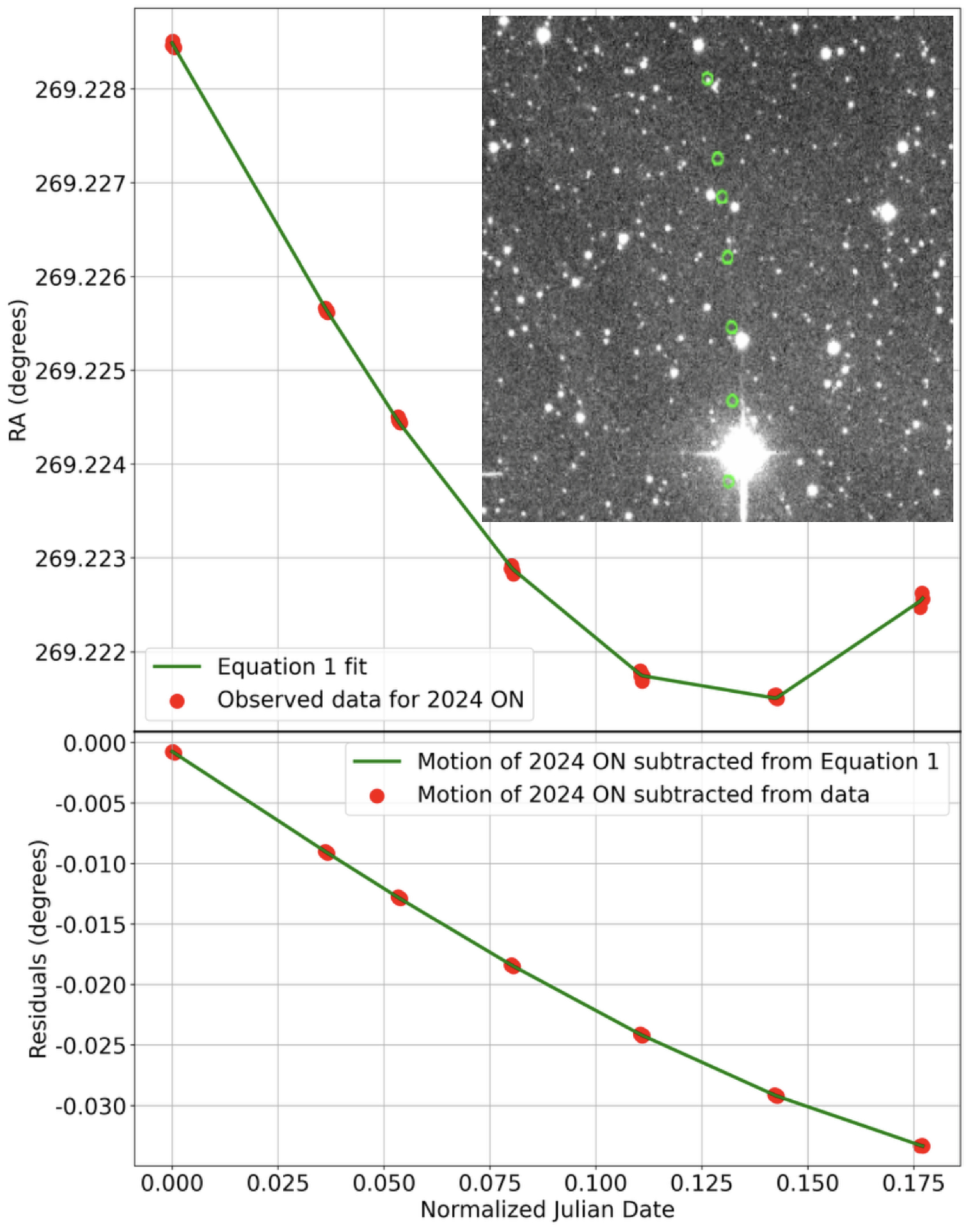 The observations of 2024 ON on 2024 September 5–6, between 23:43:00 to 03:28:10. (Top) The fitted curve to the observations is obtained from Equation (1). (Bottom) Subtraction of the asteroid’s linear motion from the overall fit. (Inset) The trail of 2024 ON across the sky for all seven observations is denoted with green circles. Here, R.A. is decreasing as shown in the red region of Figure 1, for which we observe only a short time frame of ∼4 hr.
