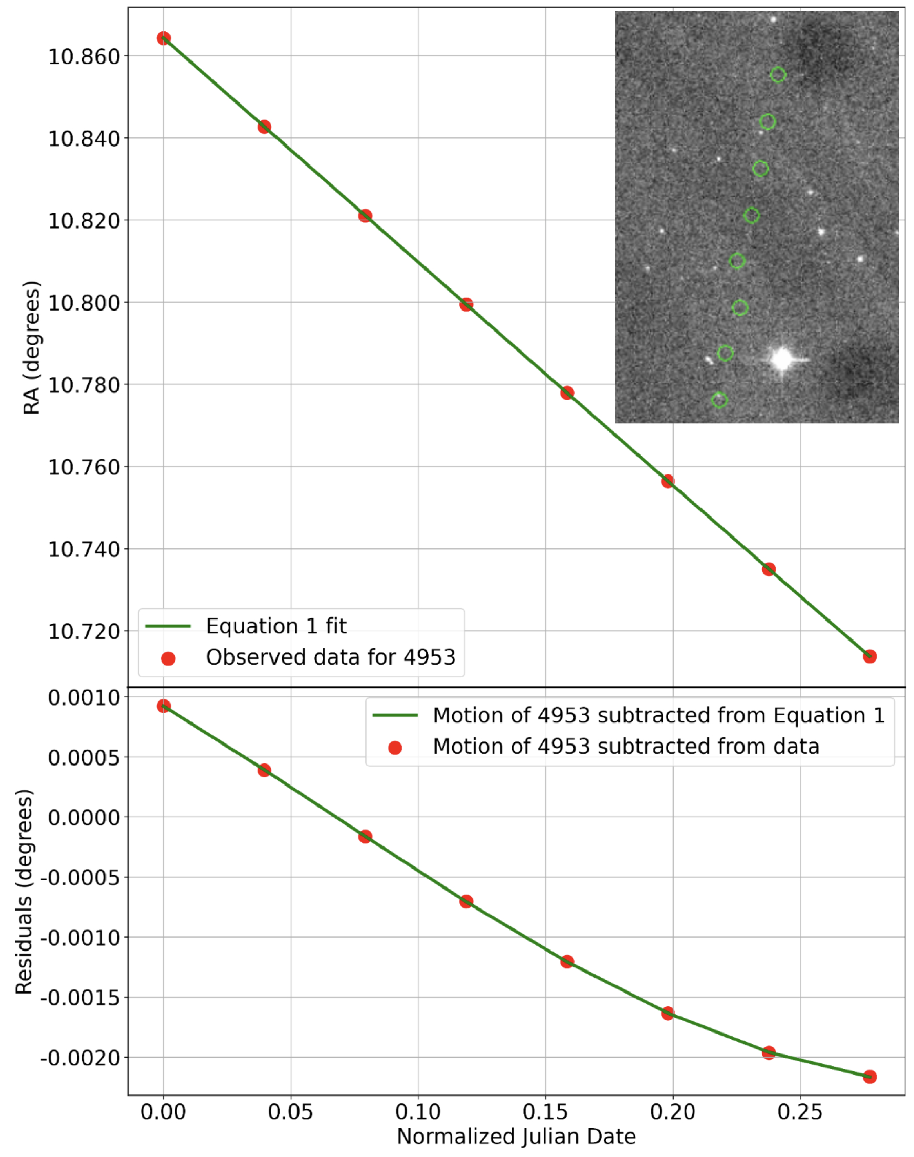 The observations of 4953 on 2024 October 31, from 00:45:14 to 07:24:23. (Top) The fitted curve to the observations is from Equation (1). (Bottom) Subtraction of the asteroid’s linear motion from the overall fit. (Inset) The trail of 4953 across the sky for all eight spline-interpolated observations is denoted with green circles. Here, R.A. is decreasing as shown in the red region of Figure 2, for which we observe only a short time frame of ∼7 hr.