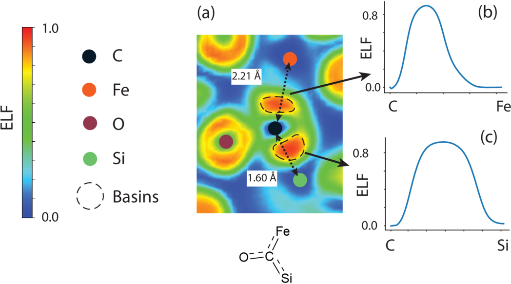 Representation of covalent carbon–silicon bonding. (a) is a cross-sectional view of the ELF field around a cluster Si–C–Fe. Arrows indicate the interactomic distance, and dashed lines denote the ELF basins. The drawing below the ELF map represents the chemical species observed. (b) and (c) show the ELF profile between C and Fe and C and Si, respectively.