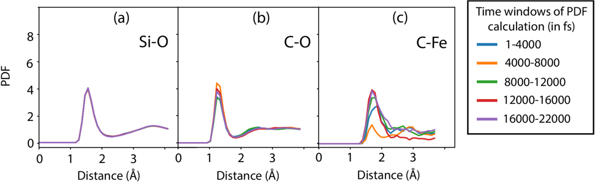 PDF of SiO, CO, and CFe pairs for different time slices of the AIMD run at 6000 K and 119 GPa.