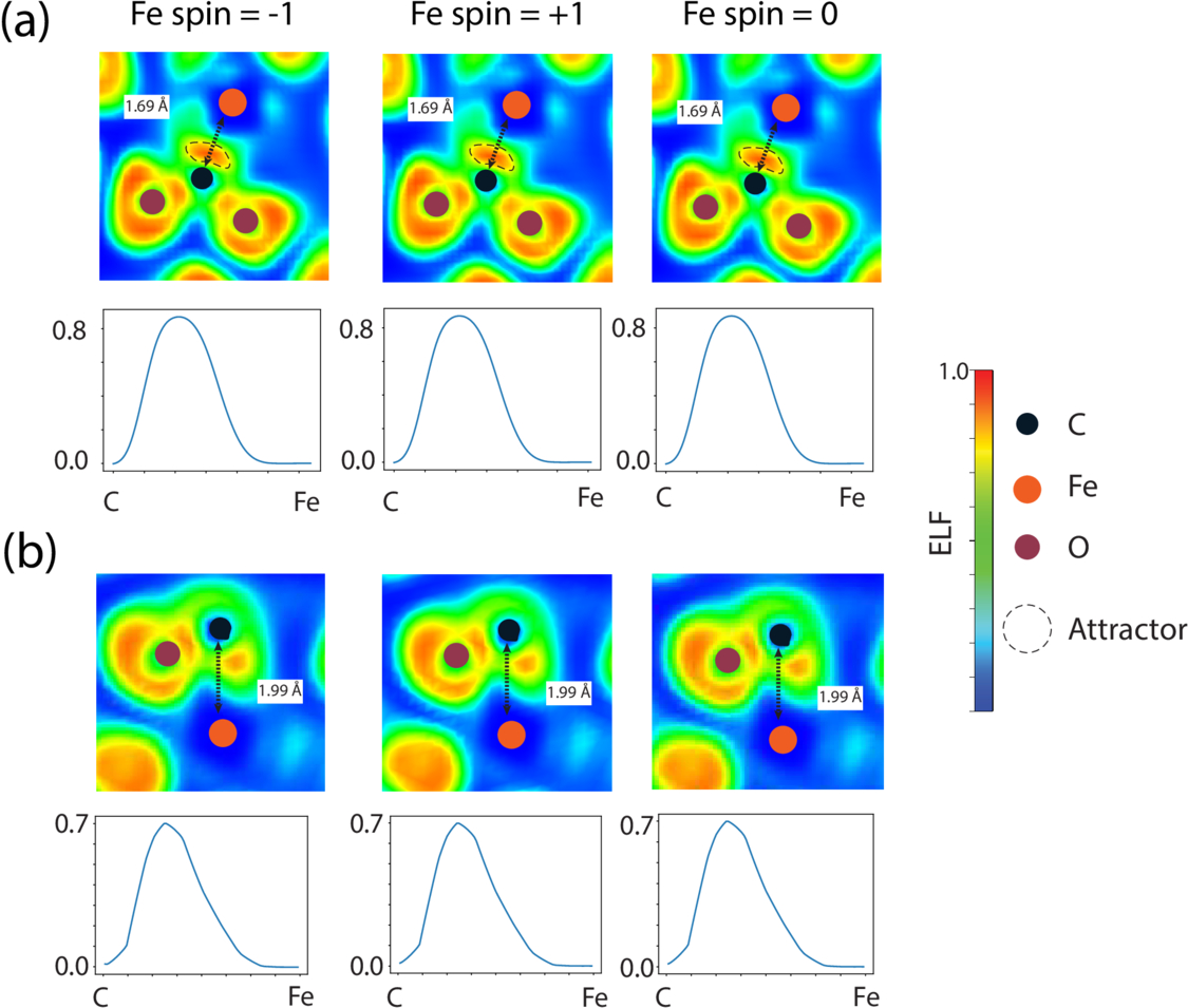 Effect of spin polarization of Fe on ELF near C–Fe bonding for a short C–Fe bond (a) and a long C–Fe bond close to the breaking point (b). The three panels represent cross-sectional views of the same simulation part for the same snapshots and the ELF profile between C and Fe. We perform three static calculations for these snapshots with spin polarization using three different initial magnetic moments. It appears that the initial magnetic moment of iron does not affect the ELF.