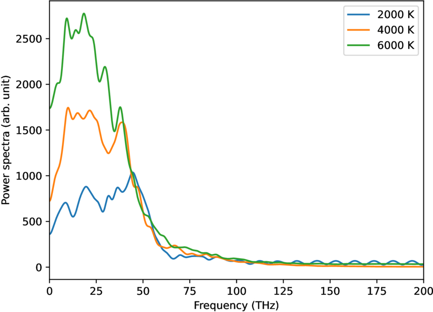 Power spectra of carbon atoms (in arbitrary unit) for the simulation at 2000 K and 26 GPA, 4000 K and 71 GPa, and 6000 K and 119 GPa as a function of frequency (in THz).