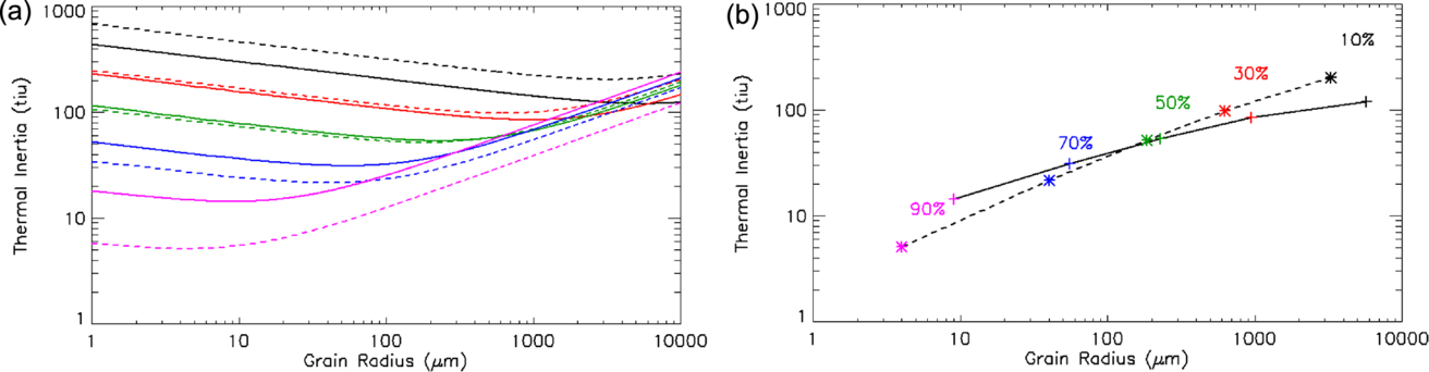 Modeled thermal inertia with respect to grain size for S-type asteroid materials. Panel (a) shows the dependence, and panel (b) shows the minimum possible thermal inertia for given porosities as marked in the plot. The curves of different colors from top to bottom represent different porosities: black 10%, red 30%, green 50%, blue 70%, and magenta 90%. The solid curves are based on B. Gundlach & J. Blum (2013), and the dashed curves are based on N. Sakatani et al. (2017).
