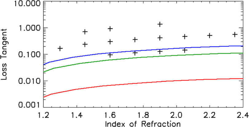 Derived loss tangent for Juno (symbols) compared to the values predicted by models (curves) with L5 OC material properties. The red curve is based on A. Brin et al. (2022), the green curve is from the A. Brin et al. (2022) model using the average dielectric values from J. B. Garvin et al. (1988), and the blue curve is from the A. Brin et al. (2022) model using J. B. Garvin et al. (1988), assuming the minimal range for the real component and the maximum range for the imaginary component. The fitted loss tangent is high compared to the model predictions.