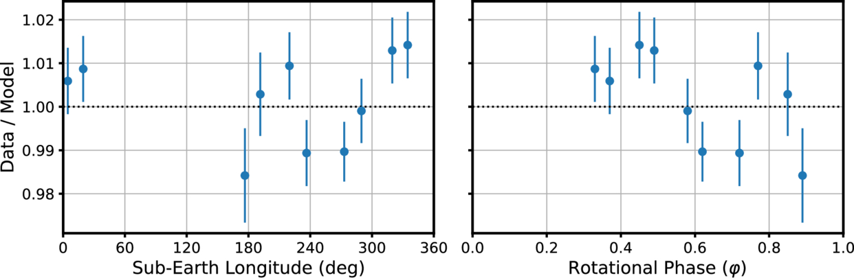 Ratios of the observed flux to the model for Juno, assuming uniform thermal and dielectric properties, with respect to longitude (left) and rotational phase, φ (right). The rotational phase follows ALMA Partnership et al. (2015). The error bars reflect the uncertainty in the flux measurement, not including any systematic uncertainty in the thermal model.