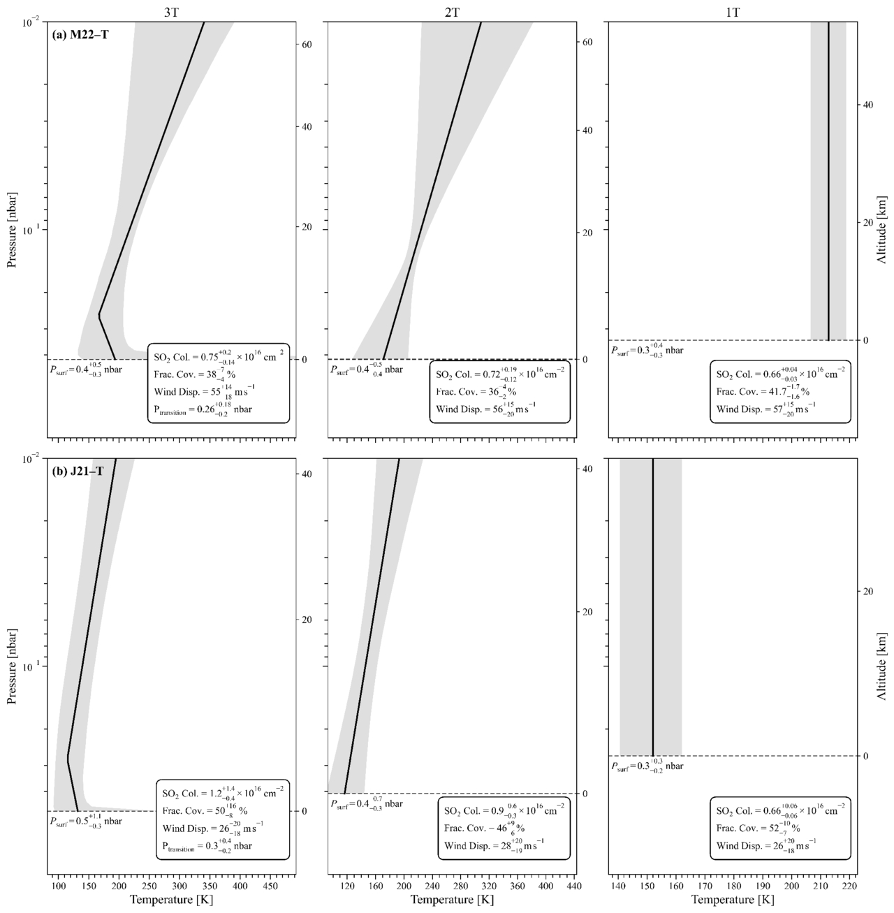 Retrieved TPs for trailing hemisphere datasets: M22-T (top row) and J21-T (bottom row). Columns show the 3T, 2T, and 1T parameterizations (left to right). The black curve is the best-fit TP; the gray band marks the 1σ credible interval. The legend for each profile provides the best-fit SO2 column density, fractional coverage, wind dispersion parameters, and, when applicable, the transition pressure (with 1σ errors). Left axes give pressure; right axes show the corresponding altitude. The dashed horizontal black line indicates the modeled surface pressure, quoted with uncertainties calculated from the upper and lower bounds of the SO2 column density.