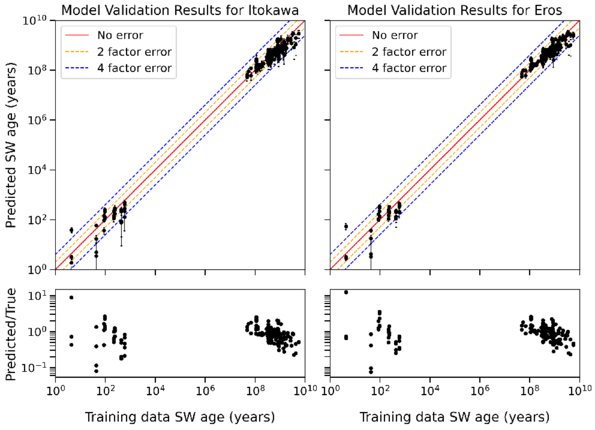 Top: scatter plot of the training and predicted values after k-fold cross validation for both Itokawa and Eros. The red line represents an exact match, the orange line a 2-factor error, and the blue line a 4-factor error. Bottom: the ratio between the predicted SW age and the training data SW age.