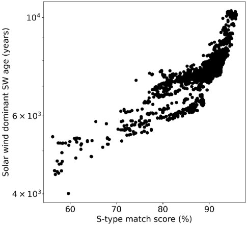 Distance-corrected solar wind dominant SW age of Eros plotted against the S-type match score by D. Korda et al. (2023).