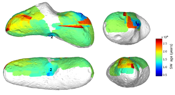 Prediction of the SW age on the Eros surface. The numbers are designated for fresh areas.