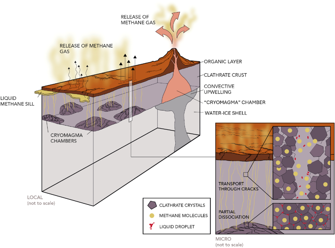 Structure of Titan’s crust and mechanisms for releasing methane into Titan’s atmosphere. Titan’s upper crust is likely composed of MCH, which, when thermally destabilized, release methane as gas (inset). Different internal processes, such as convective upwelling (and also diapiric activity), are shown in the main figure. Under certain conditions, these intrusions cause destabilization of the MCH, releasing the methane trapped within. The image on the right shows how methane can work its way through cracks in the solid MCH (in part caused by the diapir or other intrusion) above the destabilized layer toward the surface. Methane could also form a liquid layer beneath a layer of organic material. Any methane reaching the surface replenishes the methane lost through photolysis and atmospheric escape. (Figure credit: Katherine Park, JPL).