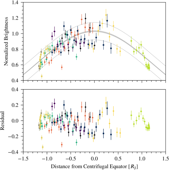 Correlation between Europa’s normalized 630.0 nm [O I] brightness and distance from the plasma sheet centrifugal equator for an electron scale height of 1.7 RJ (F. Bagenal & P. A. Delamere 2011). See Section 4.4 for a description of the normalization process. Negative distances occur when Europa is “below” the centrifugal equator, with “up” defined toward north. The solid gray line shows the best fit of Equation (5) to the complete set of normalized brightnesses with the scale height fixed. The shaded gray region shows the uncertainty in the amplitude from the fit, and the dashed gray lines show the standard deviation of the observations relative to the fit (11% at the centrifugal equator). Perceptually uniform colors and symbols (circles, diamonds, and squares) differentiate separate observing nights to allow the reader to evaluate the goodness of fit on a night-to-night basis (see the legend in Figure 2).