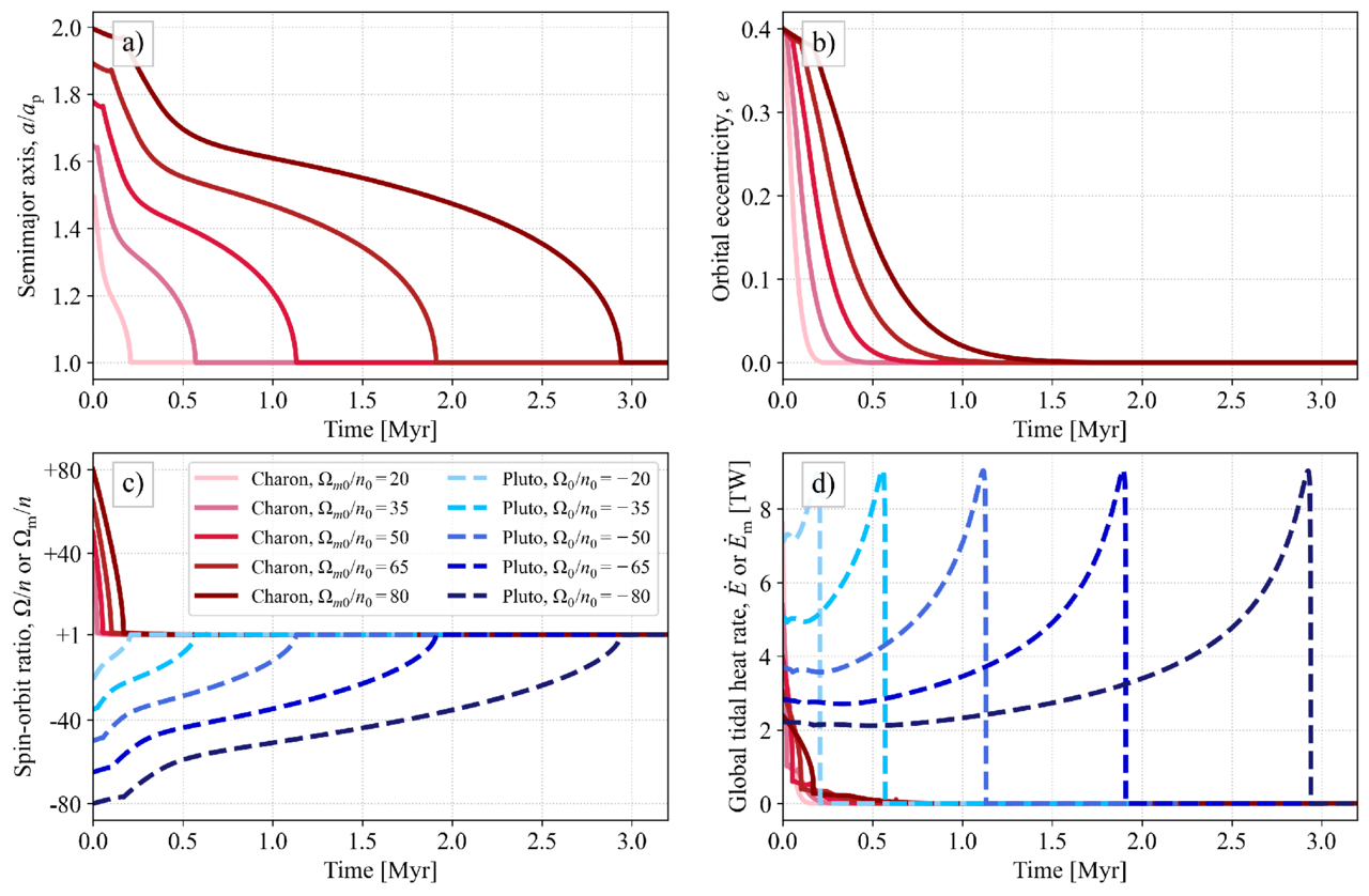 Tidal evolution of the Pluto–Charon system. An initially prograde Pluto and initially retrograde Charon are considered, with various initial rotation rates and a fixed initial eccentricity e0 = 0.4. Panel (a) semimajor axis ratio a/ap (where ap is the present semimajor axis value); panel (b): eccentricity; panel (c): spin rates Ω/n (shades of blue) and Ωm/n (shades of red); panel (d): tidally dissipated power, ﹩\dot{E}﹩ and ﹩{\dot{E}}_{{\rm{m}}}﹩. In accordance with the adopted sign convention, panel (c) shows the spin rate Ω of an actually prograde Pluto as negative, while the depicted spin Ωm of a retrograde Charon is positive.