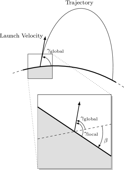 Conceptual sketch of the geometric effect of local slopes. A local surface tilt β rotates the release vector, changing its elevation angle from γglobal to γlocal, which alters the resulting particle trajectory.