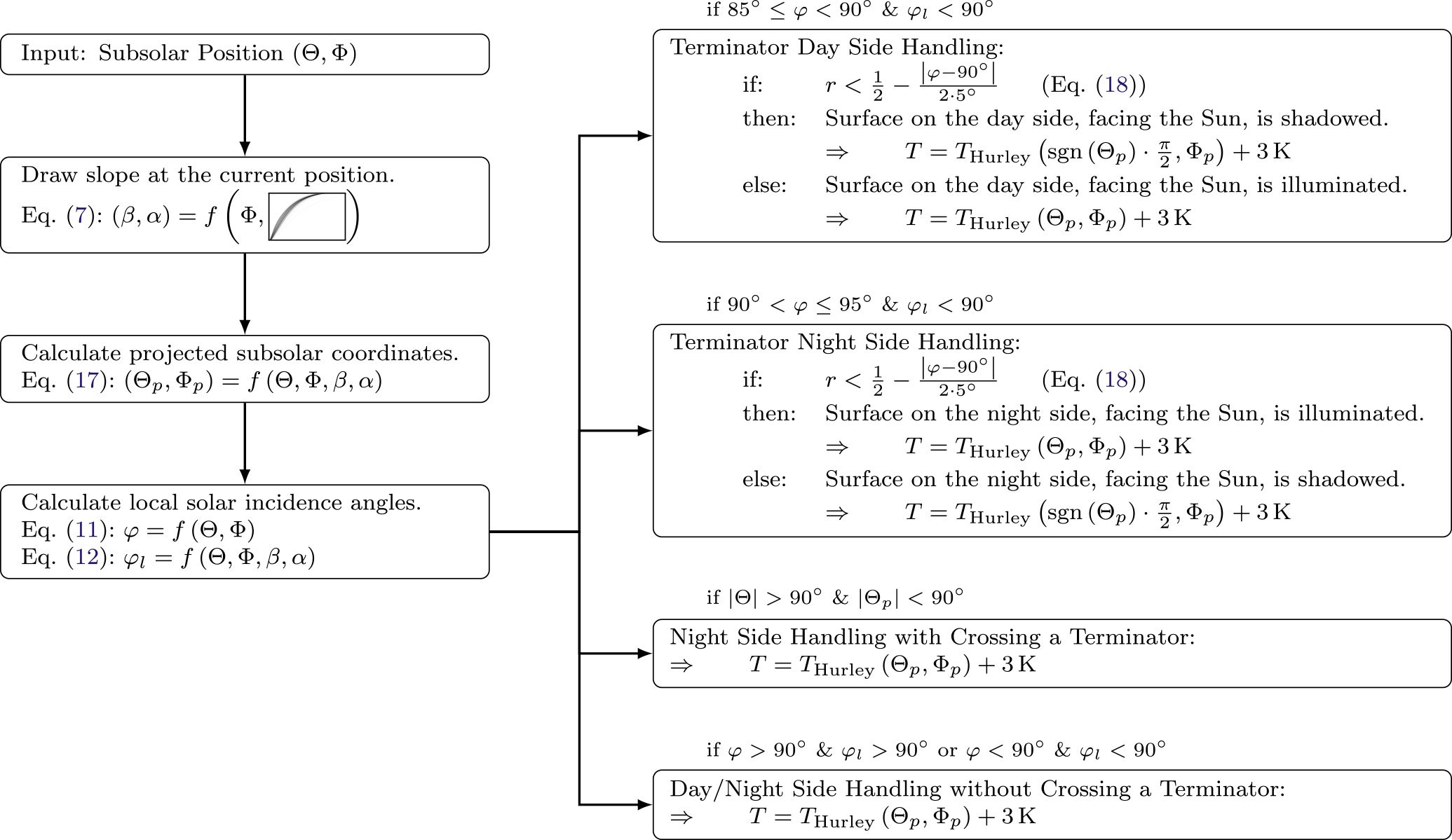 Procedure of the probabilistic temperature model. Global position, slope, and azimuth are used to compute a local solar incidence angle, which is projected into the D. M. Hurley et al. (2015) model. Terminator handling and a global 3 K correction are applied, yielding surface temperature distributions.