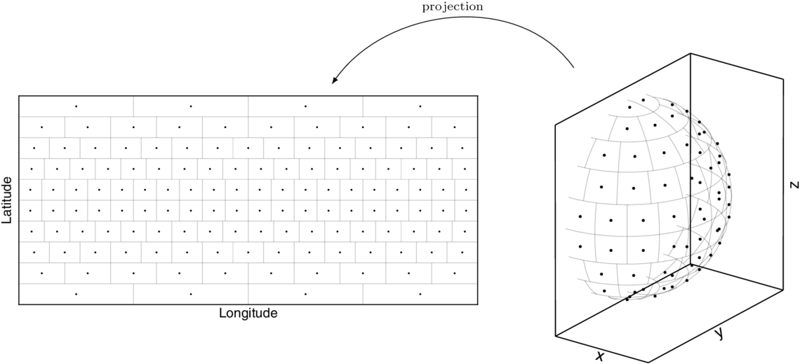 Schematic of the discretization scheme, shown for a single radial layer. The two-dimensional projection (left) and three-dimensional representation (right) illustrate how the number of longitudinal elements decreases toward the poles while the element areas remain nearly equal.