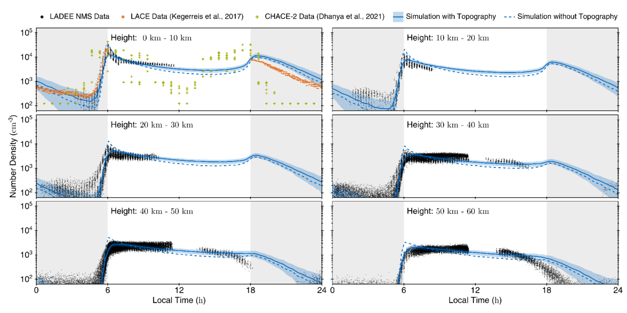 Comparison of the 40Ar number densities with data from LADEE’s NMS, Apollo’s LACE instrument (J. A. Kegerreis et al. 2017), and surface-projected CHACE-2 data (M. B. Dhanya et al. 2021), separated into the first six 10 km layers based on the simulation’s discretization. The blue band around the simulation results represents one standard deviation of uncertainty, based on the variance within the MC steps. For comparison, the results of a simulation without topography have been added as blue dashed lines. The shaded gray area marks the lunar nightside.