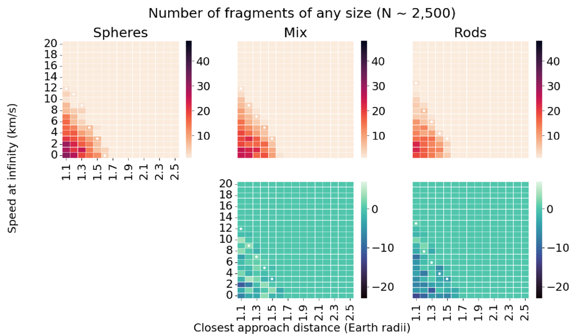 Heat maps of total fragment production for trials S1, M1, and R1. We include any agglomeration of two or more constituents in our count.