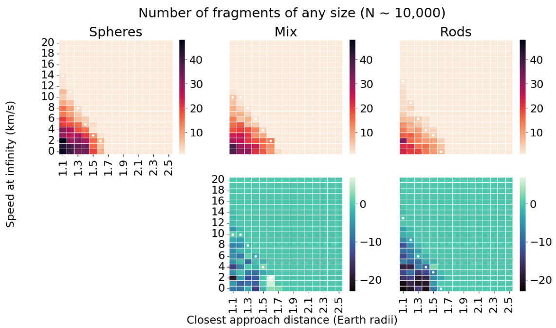 Heat maps of total fragment production for trials S2, M2, and R2. We include any agglomeration of two or more constituents in our count.